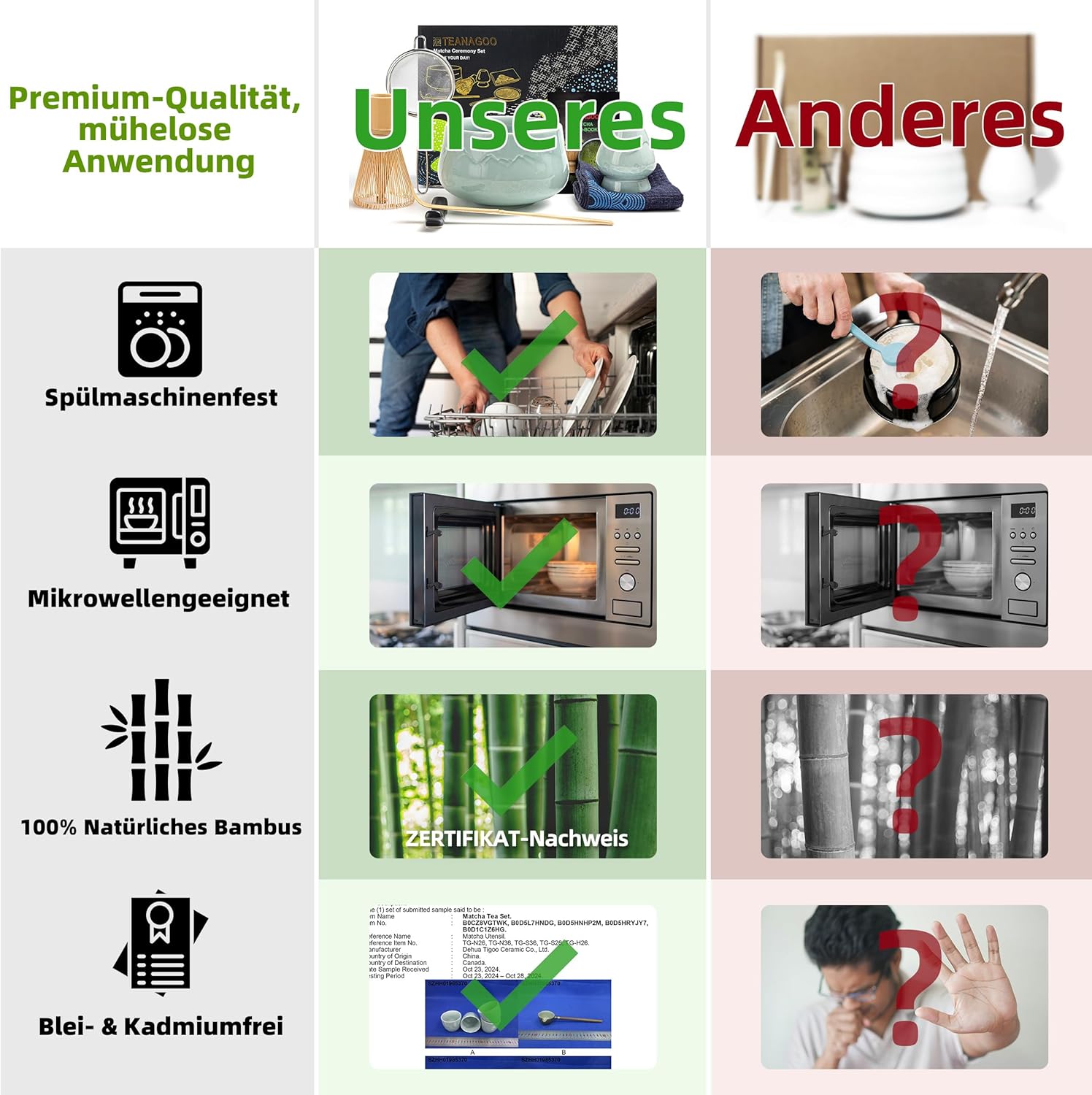 - Gesamte Set besteht aus Bambus und hochwertiger Keramik. Bei diesem Produkt wurden keine Anstriche verwendet. Es besteht zu 100 % aus Bambus und ist mit einem Pflanzenöl-Finish versehen, um seine Haltbarkeit zu verbessern. Die Matcha-Schalen waren