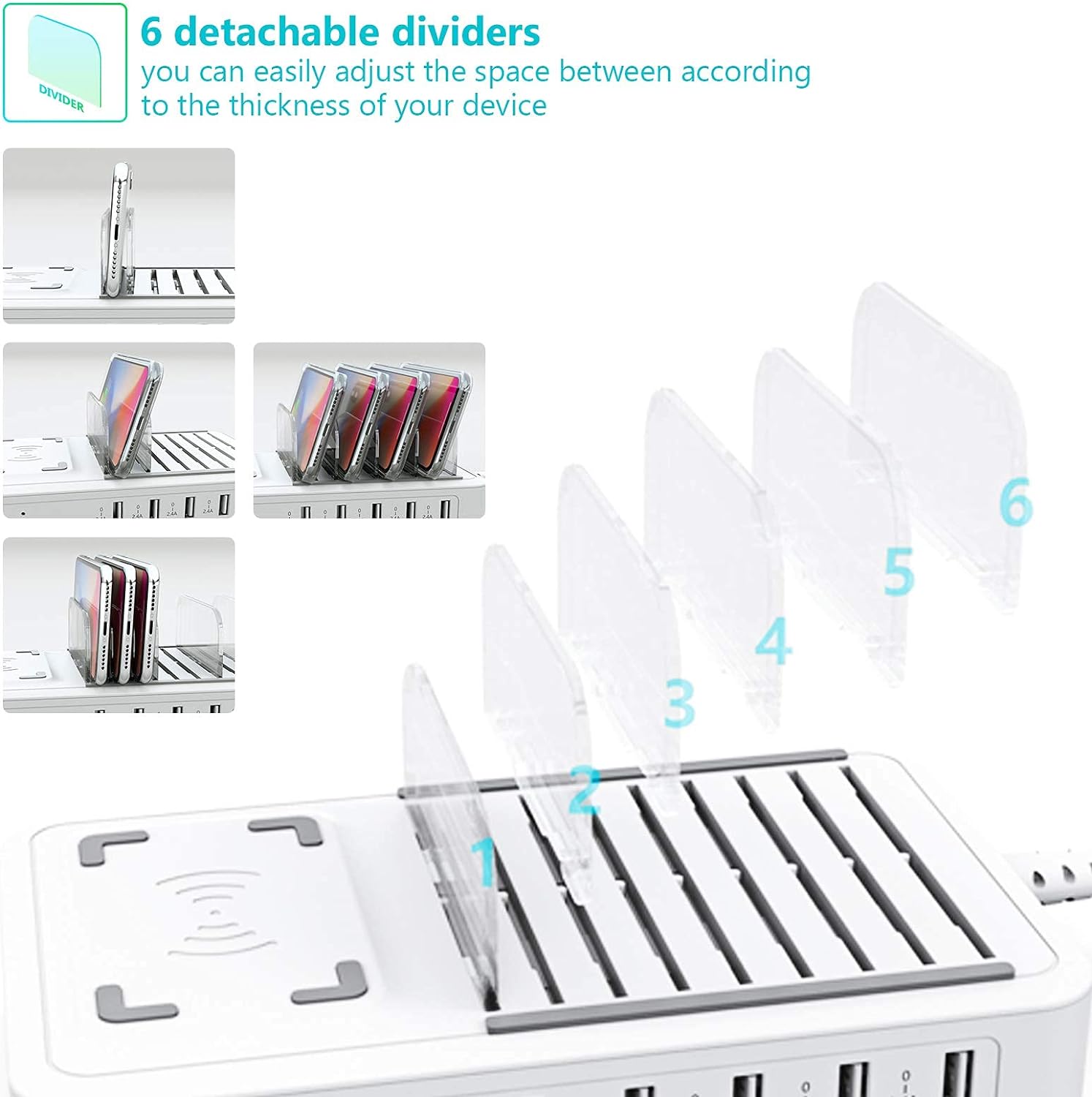 - FUNKTIONIERT MIT JEDEM GERÄT - Diese USB-Ladestation verfügt über 1 wireless charger und 5 USB-Anschlüsse, an denen bis zu 6 Geräte gleichzeitig geladen werden können. Diese Ladestation funktioniert gut mit jedem USB-Gerät wie Android-Smartphones,