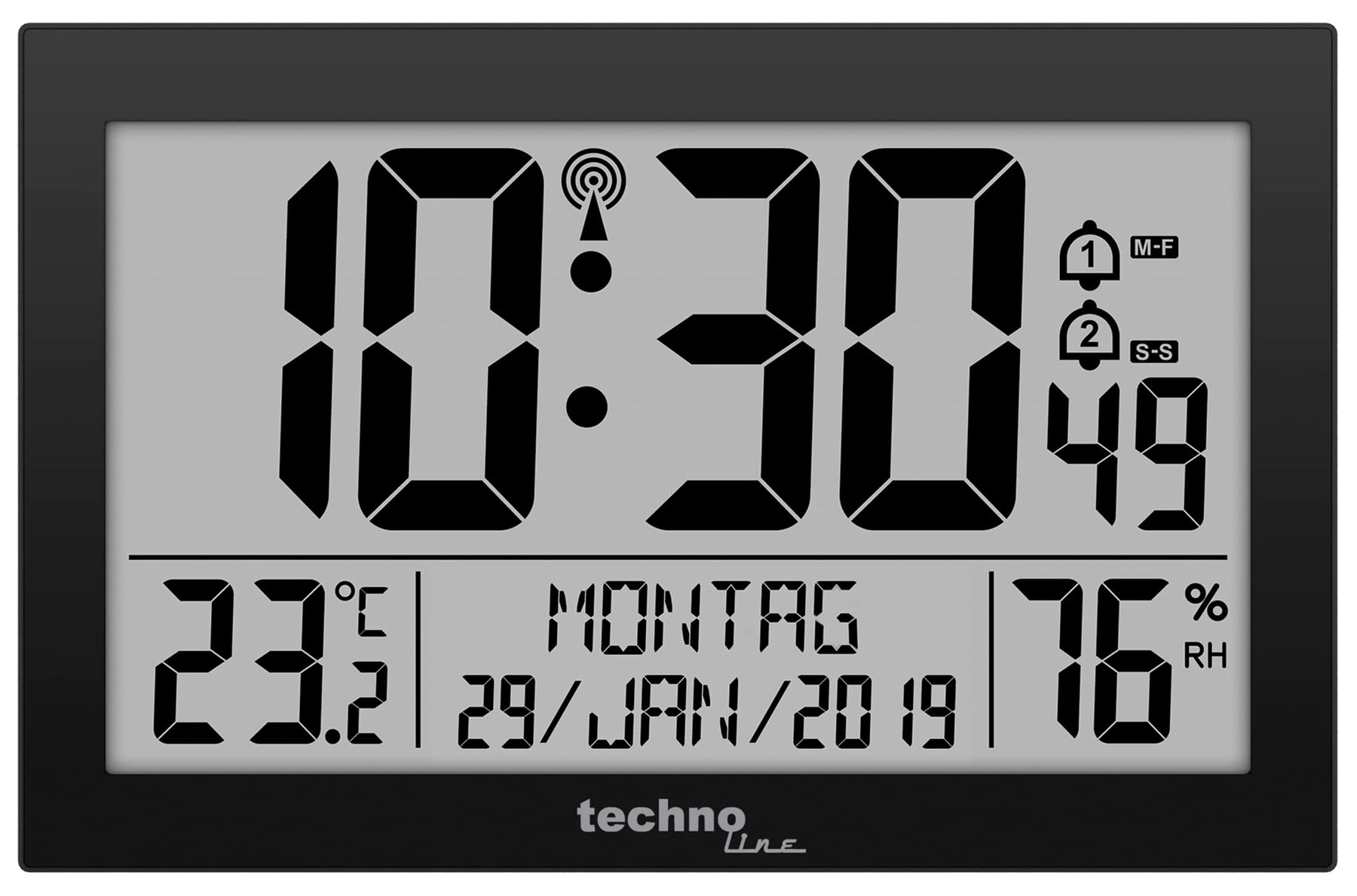 - Neben der genauen Uhrzeit über das DCF-77 Signal können Sie zusätzlich das Datum, den Wochentag, die Temperatur und die Luftfeuchtigkeit ablesen.