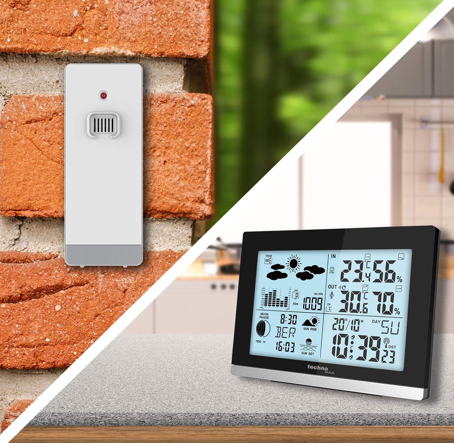 - Weitere Funktionen: DCF-77 Funkuhr mit manueller Einstelloption, 12/24 h Zeitanzeige, Vorhersage von Wettersituationen, Sonnenauf- und -untergangsanzeige, sowie Mondphasenanzeige