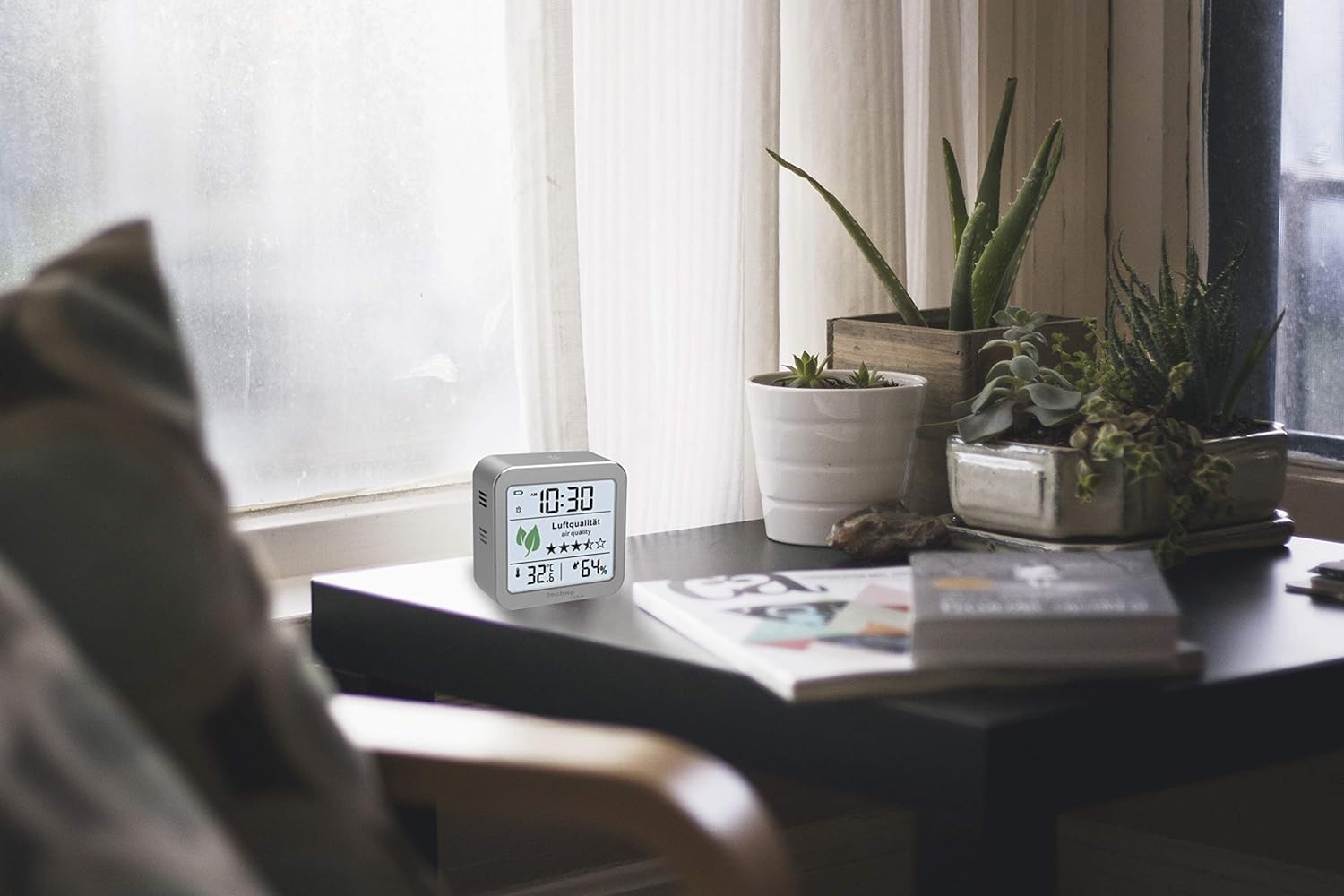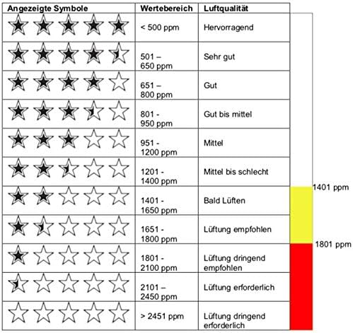 - Lüftungsempfehlung: ist die Luftqualität zu schlecht, erhalten Sie eine Lüftungsempfehlung (Lüftungsempfehlung funktioniert wie ein Ampelsystem: rote Hintergrundbeleuchtung = schlechte Luft, bitte lüften)