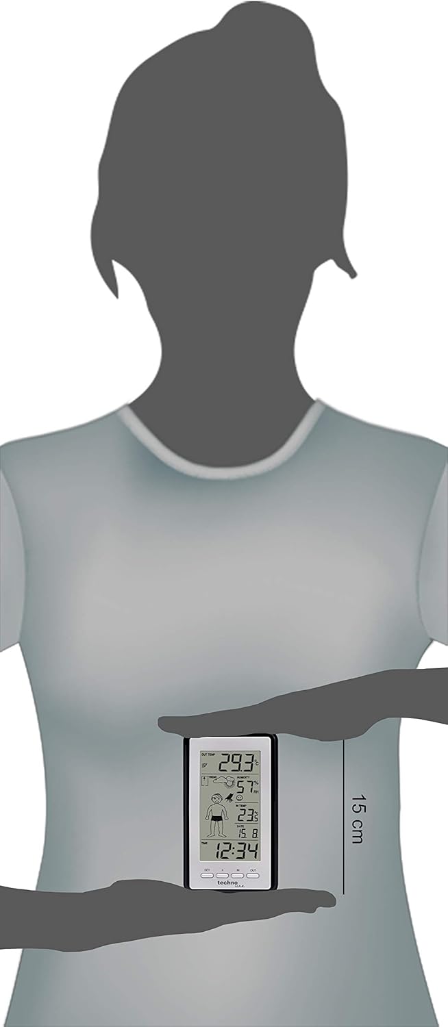 - Neben der genauen Uhrzeit über Funkempfang können Sie auf dem Display noch die Innen- und Aussentemperatur, die Innenluftfeuchte, das Datum und den Wochentag ablesen