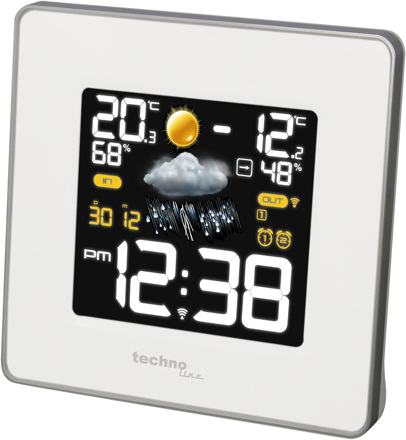 - Ein Blick reicht aus und Sie erfahren neben der genauen Uhrzeit über Funkempfang noch die Innen- und Aussentemperatur, die Innen- und Aussenluftfeuchte, sowie das Aktuelle Datum