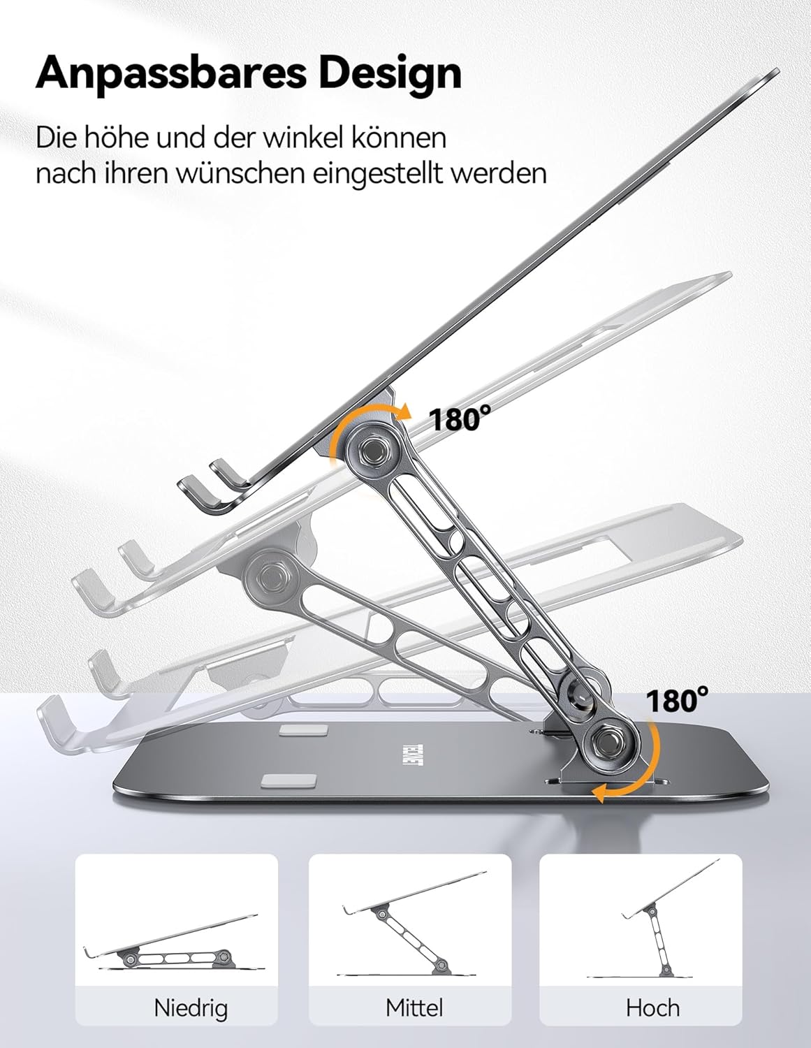 - 【Robust & Rutschfest】Der Notebook Ständer ist aus hochwertiger Aluminiumlegierung und legiertem Stahl gefertigt und verfügt über eine zweiachsige Unterstützung, die bis zu 6 kg (13,2 lbs) ohne Wackeln tragen kann. Der MacBook Ständer ist mit