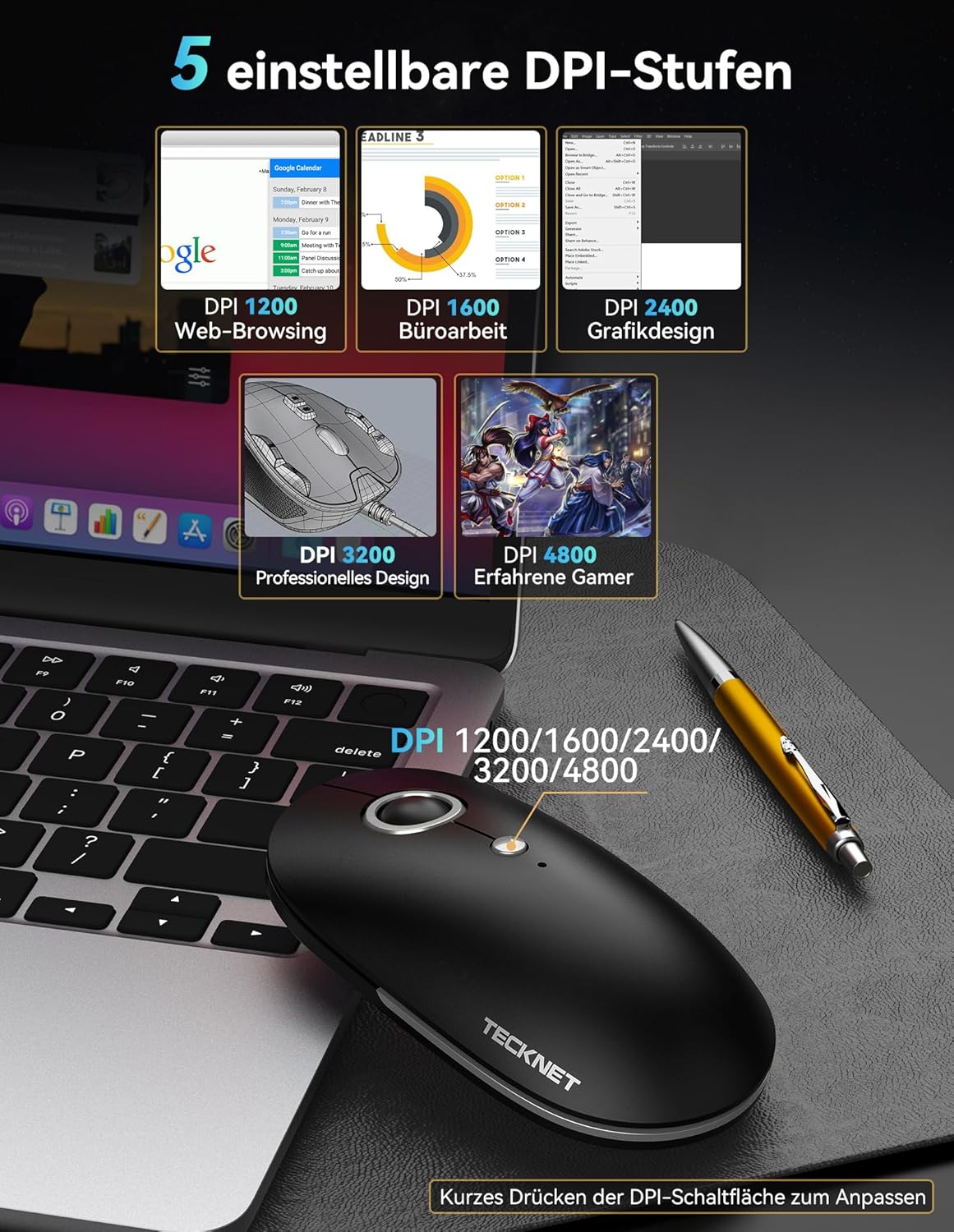 - 4800 DPI Präzise Steuerung: 5 DPI-Stufen (4800/3200/2400/1600/1200) um verschiedenen Anforderungen gerecht zu werden. Ob für präzises Grafikdesign, Gaming oder den alltäglichen Bürogebrauch, Sie erleben eine flüssige Bedienung ohne Aussetzer oder