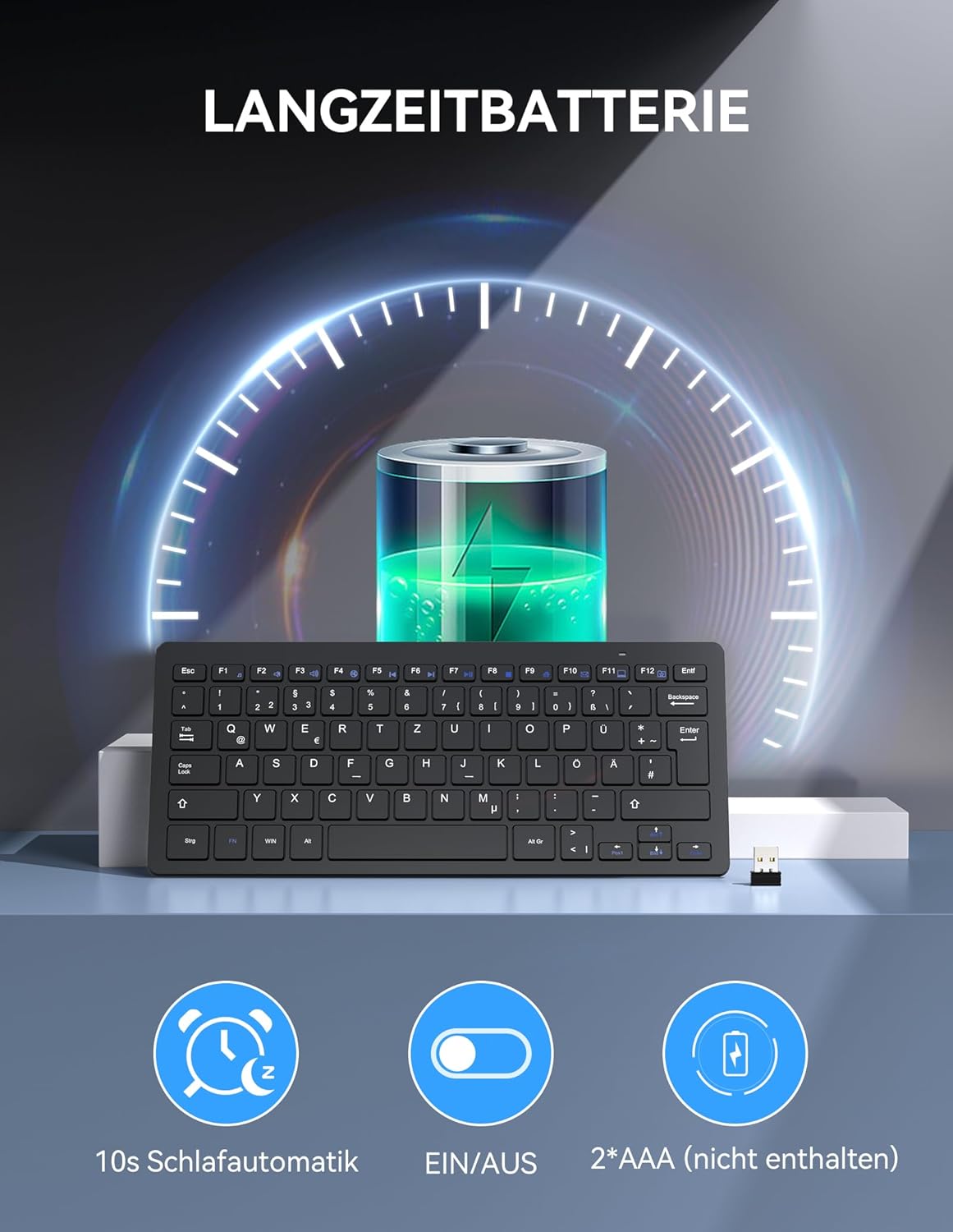 • LANGES BATTERIE-LEBEN: Lange Batterielebensdauer ermöglicht es Ihnen, das Gerät fast ein Jahr zu verwenden, ohne es aufladen zu müssen; Wenn Sie es gerade nicht verwenden, geht das kabellose tastatur in einen Stromsparmodus.