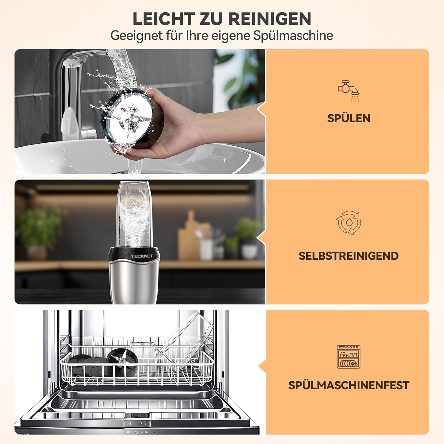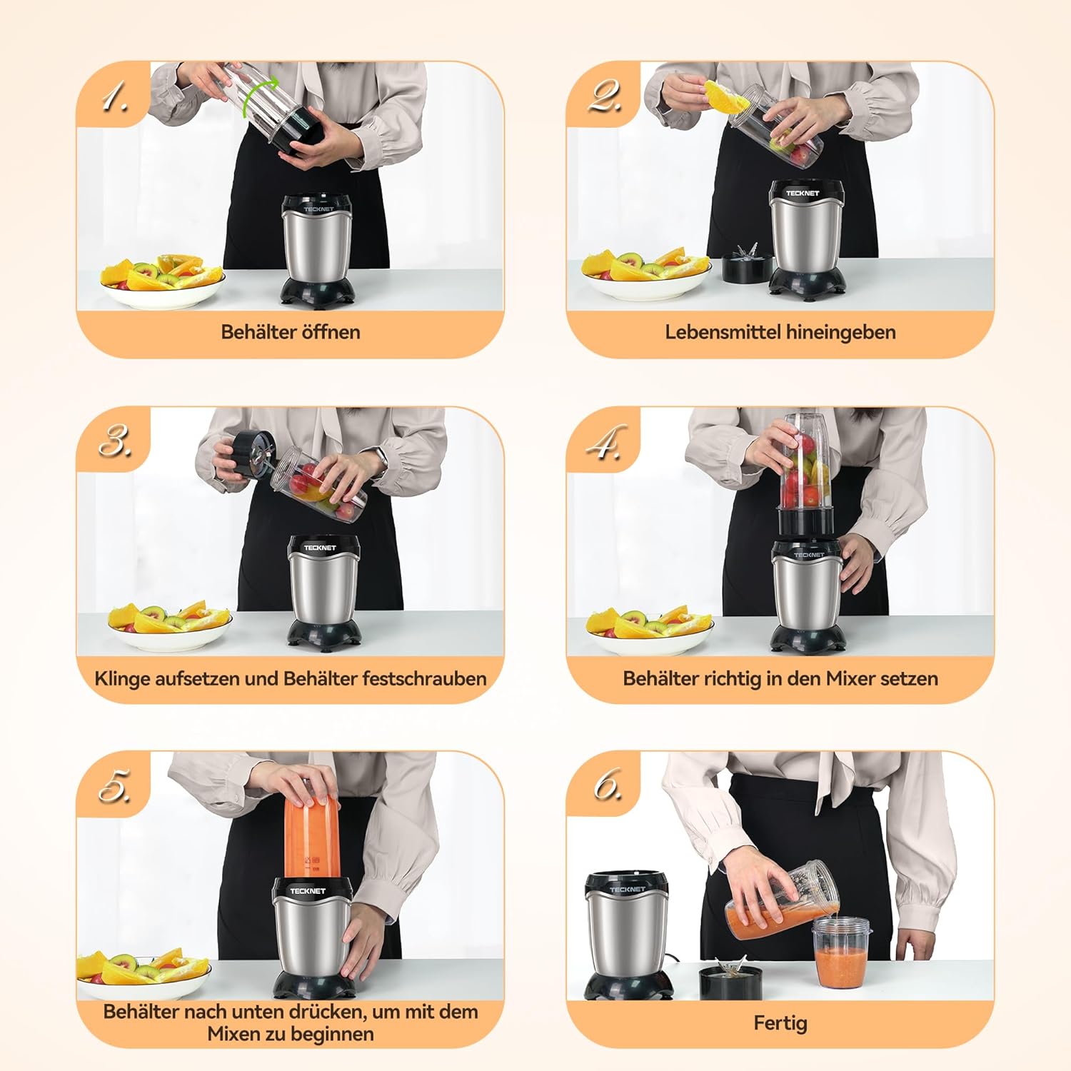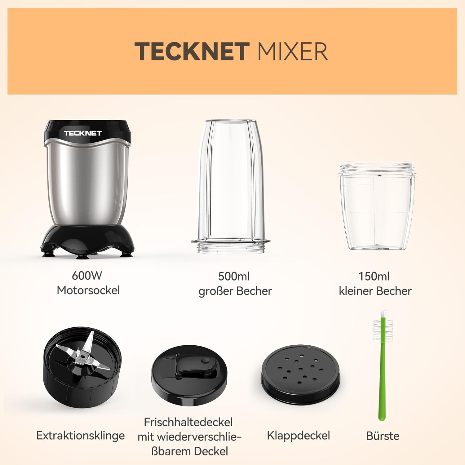 - 【Vielseitiges Zubehör】TECKNET Blenders(EU Stecker), 600W Motorblock, 1x 500ml Becher, 1x 150ml Becher,2x Ausgussdeckel,1x, Rezeptheft. (TECKNET 36-monatige Garantie)