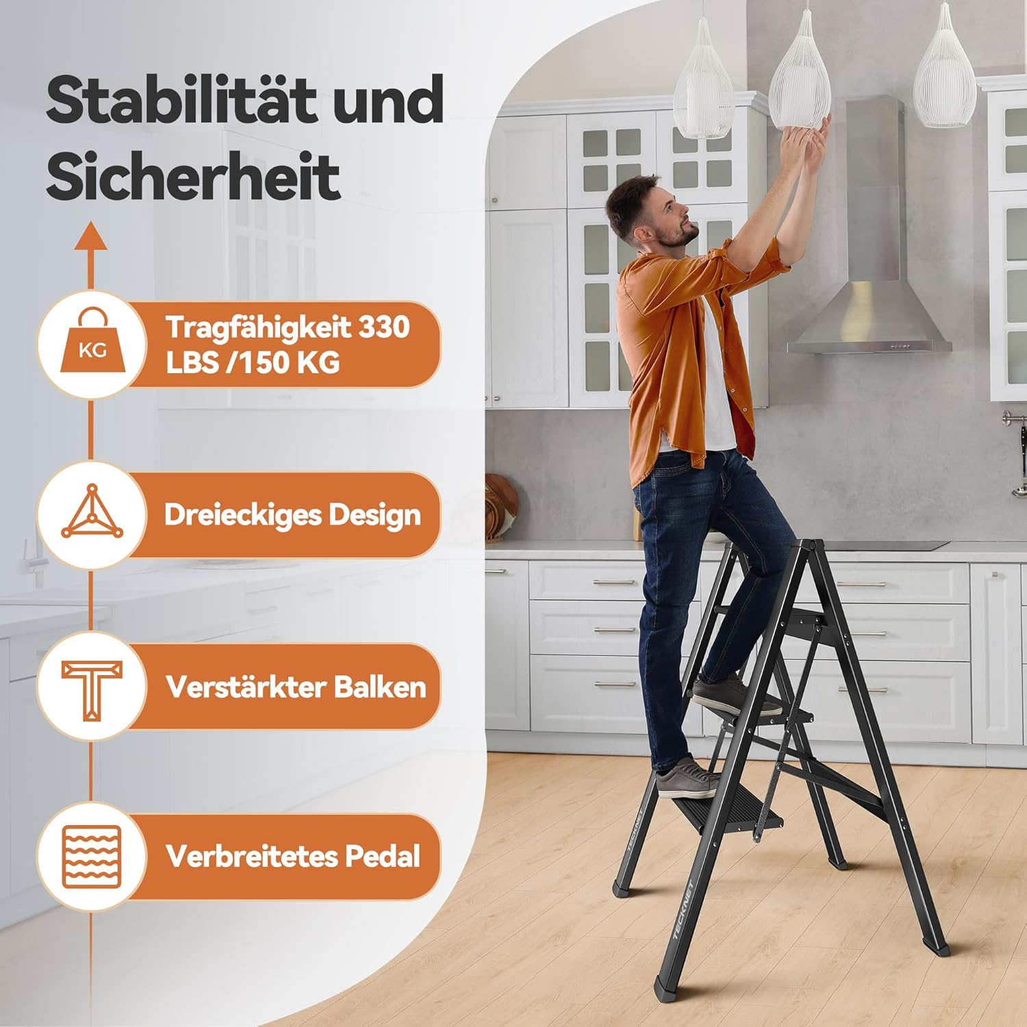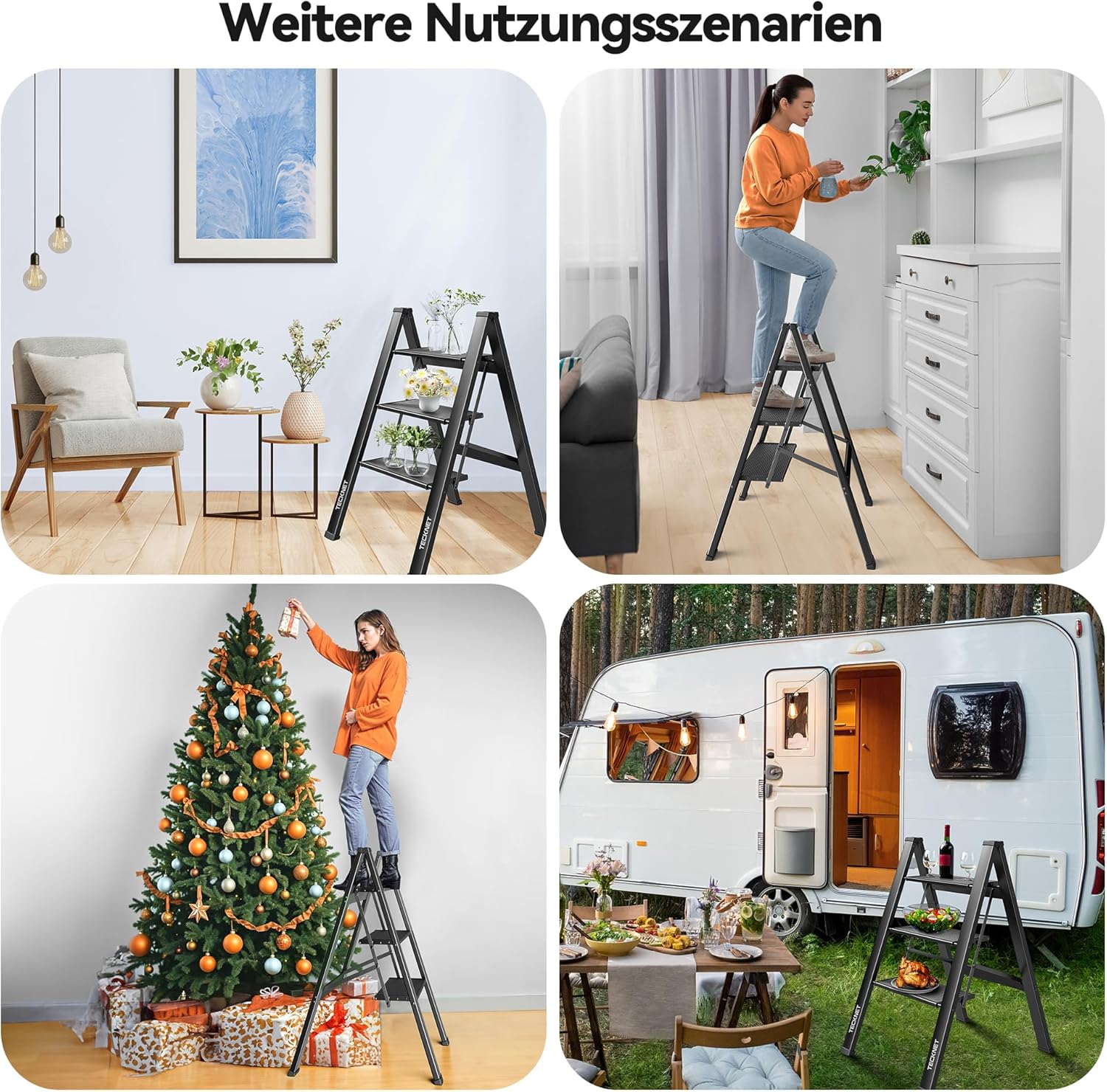 - 【Breite Anwendung】 Die 3-stufige Leiter kann vielseitig als unverzichtbares Werkzeug für Haus, Garten, Hof, Studio, Werkstatt, Büro oder Partydekoration, als Höhenhilfe für Schränke, Kleiderschränke, zur leichten Reinigung, zum Malen, für