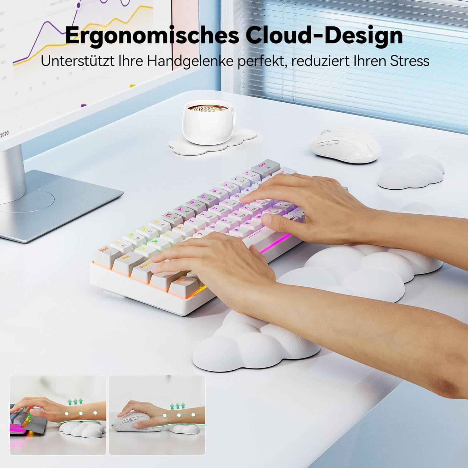 - 💻【3-In-1-Set & Passende Grösse】Diese stylische und witzige Handballenauflage ist ein 3-In-1-Set mit einer Cloud-Tastatur-Handgelenkauflage, Maus-Handgelenkauflage und Cloud-Untersetzer. Sorgfältig entworfen und passend für die meisten Tastaturen
