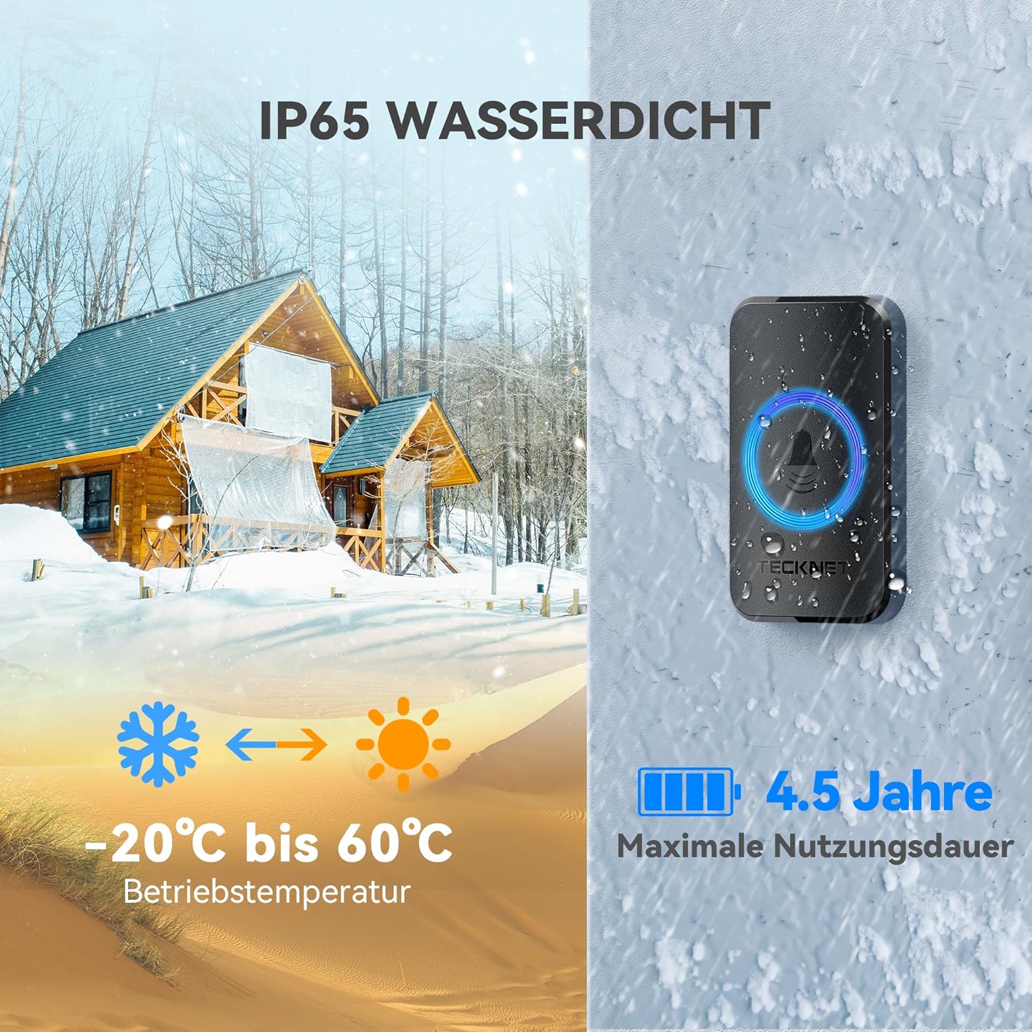 - 【IP65-wasserdichter Türklingel】Das Klingel-Set verwendet eine CR2032-Lithium-Batterie für den Klingelknopf, die aufgrund ihres extrem niedrigen Stromverbrauchs eine Lebensdauer von bis zu 4,5 Jahren hat. Funk klingel funktioniert zwischen -20°C