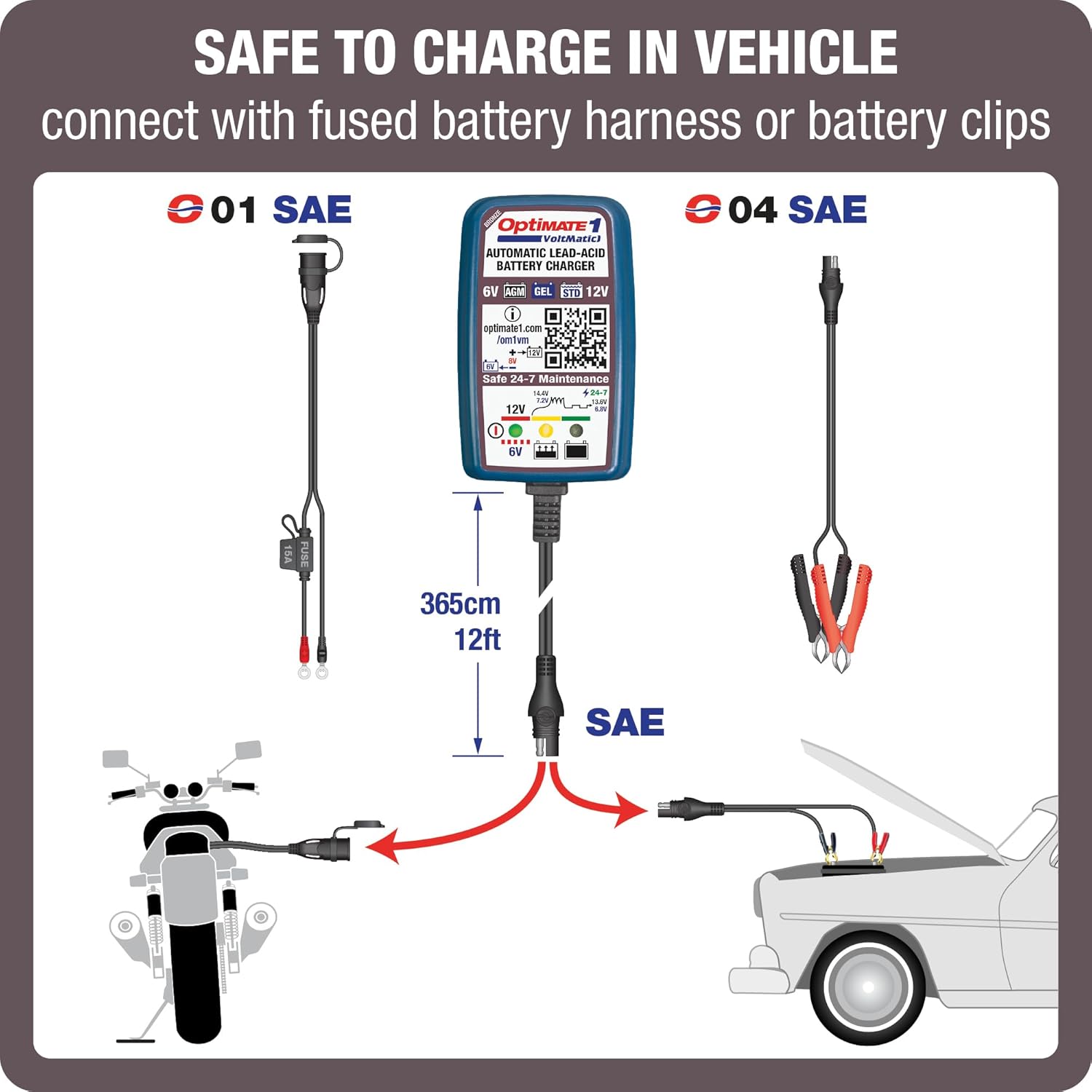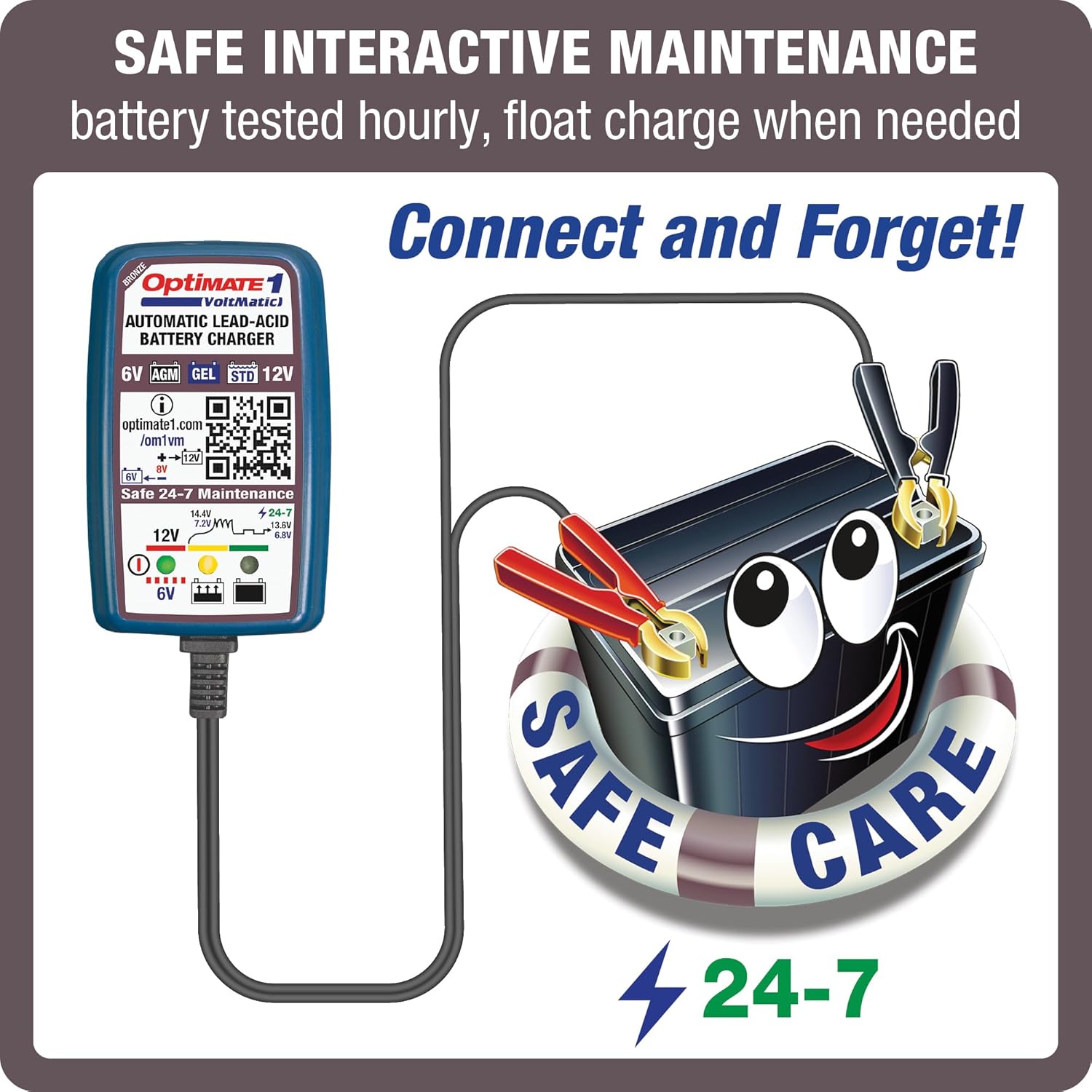 • Lädt und liefert langfristige Wartung – an die Batterie anschliessen und OptiMate 1 VoltMatic erledigt den Rest, keine Aufsicht erforderlich!