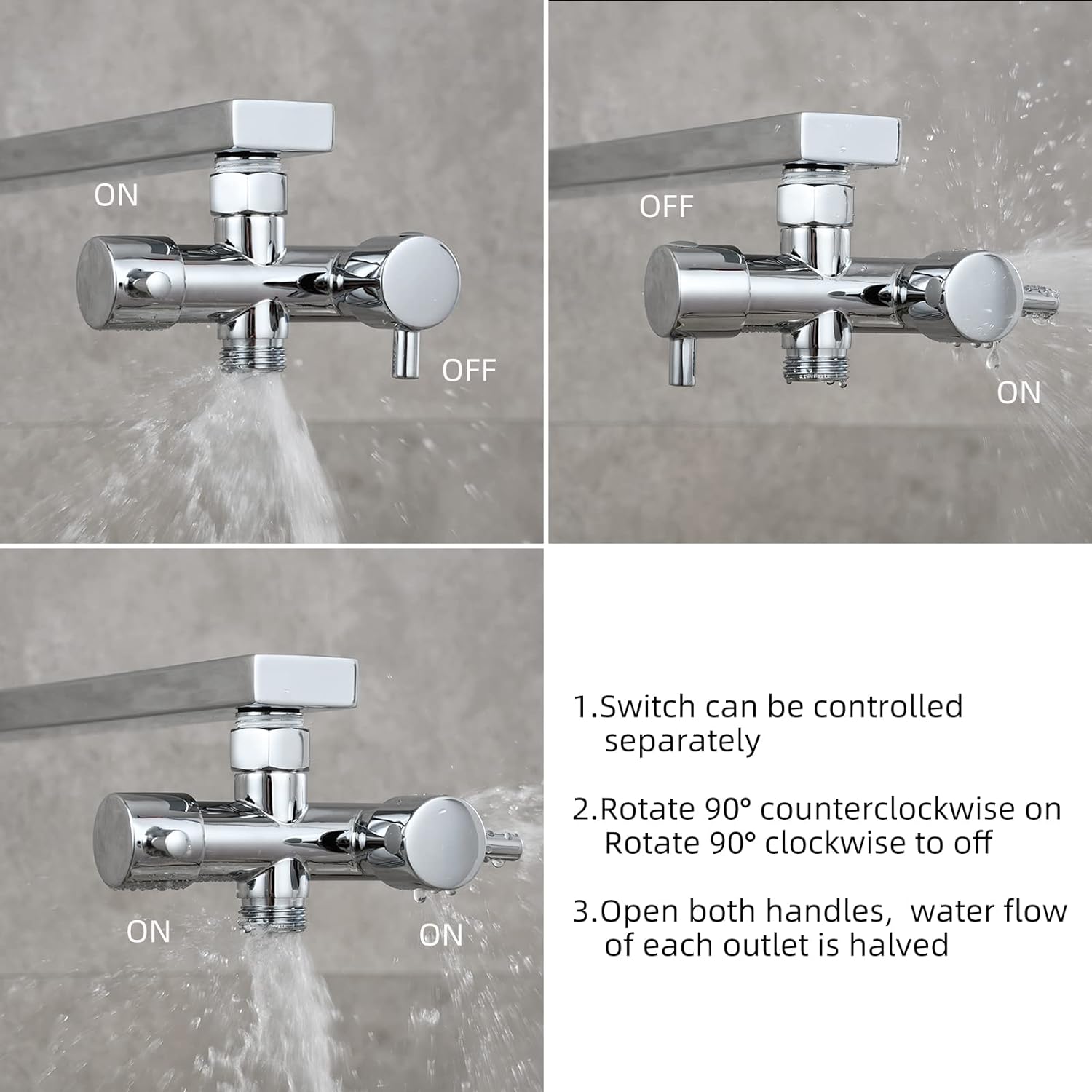 - Doppelhebelgriffe: Der 2-Wege-Schlauchteiler verfügt über lange Abschaltsteuergriffe, die eine reibungslose und einfache Einstellung des Durchflusses von Voll bis Aus ermöglichen