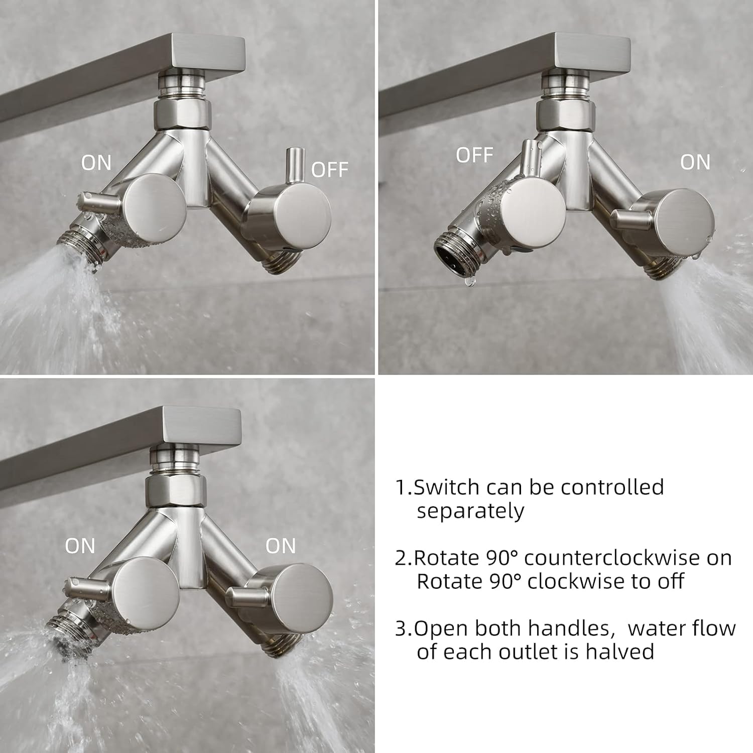 - Doppelhebelgriffe: Der 2-Wege-Schlauchteiler verfügt über lange Abschaltsteuergriffe, die eine reibungslose und einfache Einstellung des Durchflusses von Voll bis Aus ermöglichen