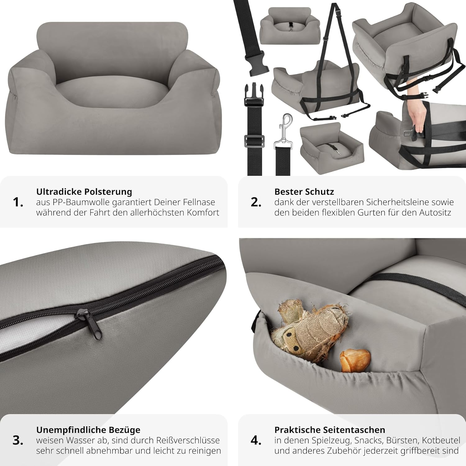 • HUNDEBETT AUTO MIT PRAKTISCHEN SEITLICHEN AUFBEWAHRUNGSTASCHEN: Die zwei seitlichen Taschen bieten praktischen Stauraum für Hunde Zubehör wie Spielzeuge, Leckerlis oder Wasserflaschen. So hast Du alles griffbereit und kannst Dich voll und ganz auf die
