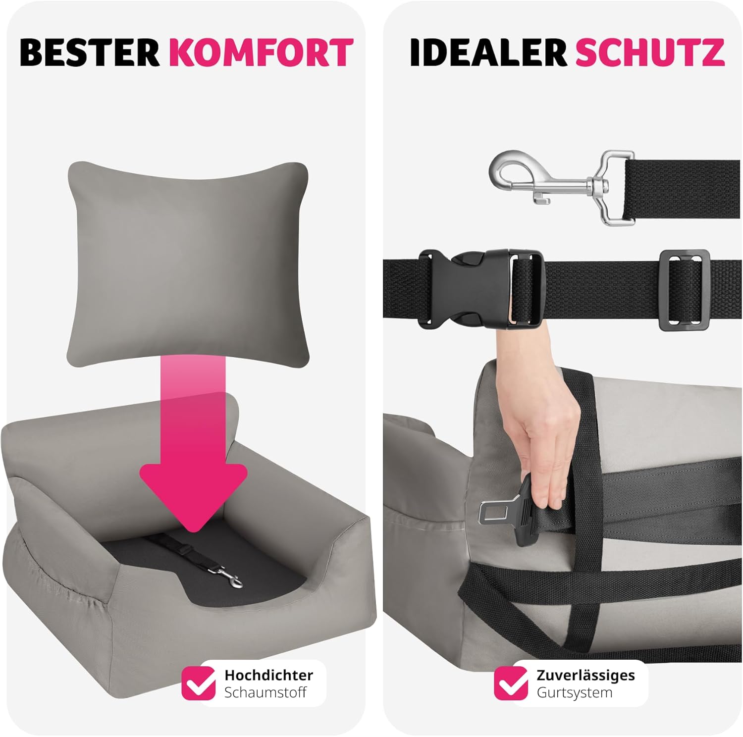 • HUNDESCHUTZ DANK ANPASSBARER BEFESTIGUNGSGURTE: Für maximale Sicherheit und perfekte Hundesicherung während dem Hundetransport ist der Autositz Hund mit 2x verstellbarem Autogurt ausgestattet, sodass sich das Zubehör mühelos an verschiedene