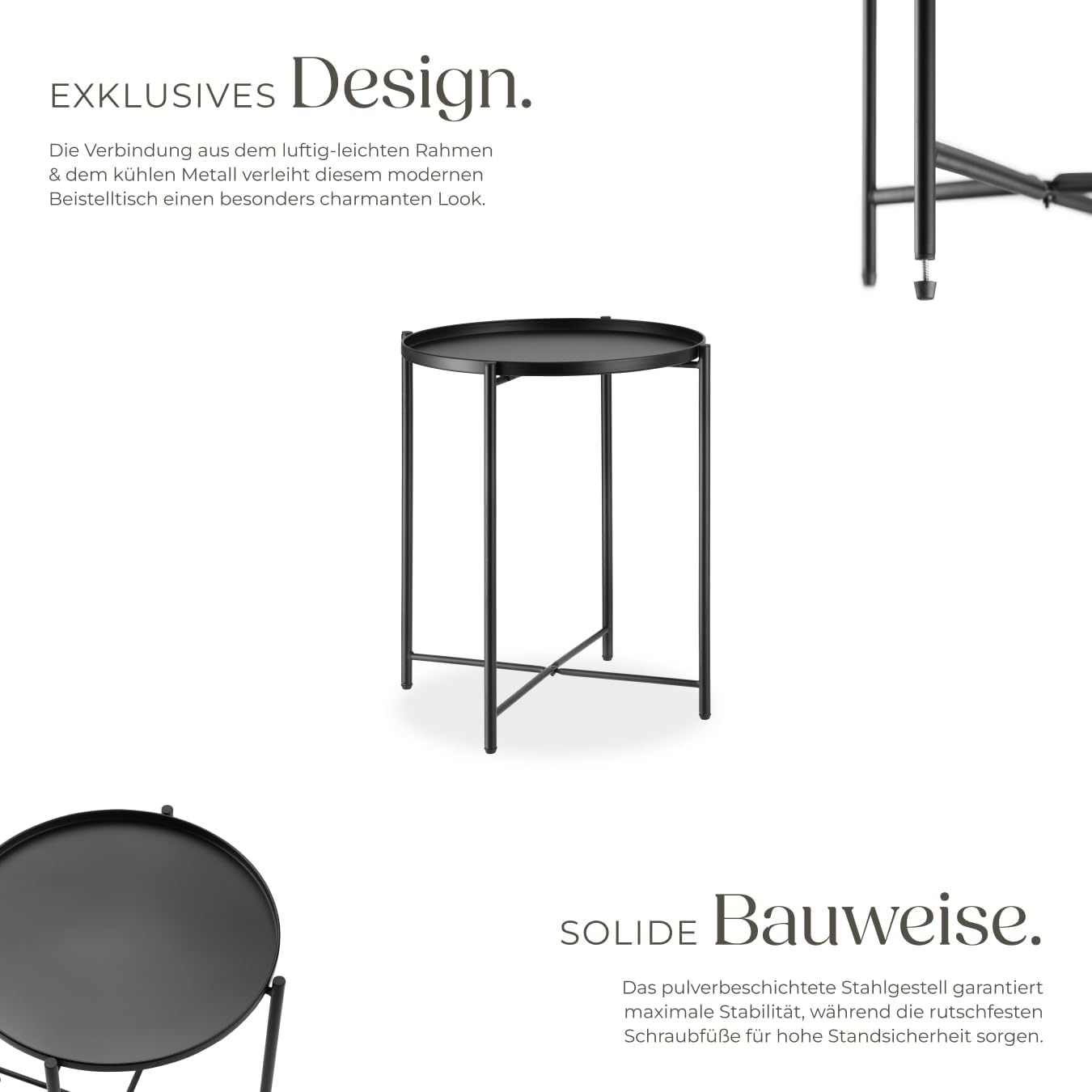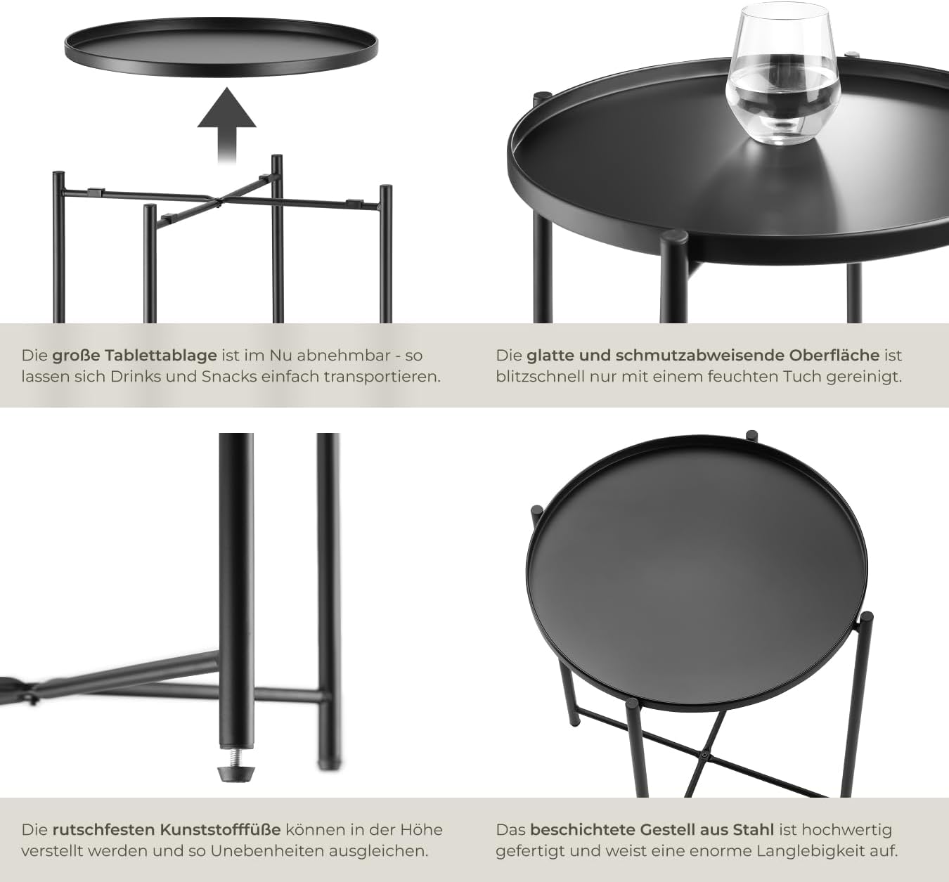 • PRODUKT-DETAILS: Totalmasse (LxBxH): ca. 45,5 x 45,5 x 53 cm // Innenmasse Ablagefläche (ØxH): ca. 41 x 1,8 cm // Durchmesser Tischbeine: ca. 1,6 cm // Verstellbarkeit der Kunststofffüsse: ca. 1 cm // Belastbarkeit: 30 kg // Gewicht: ca. 2,3 kg.