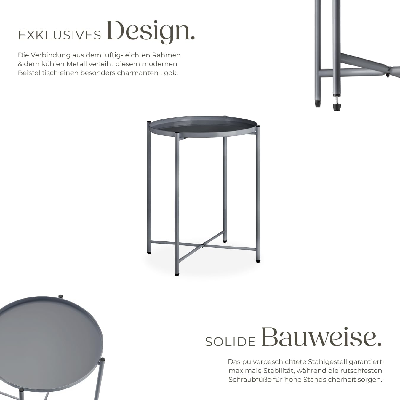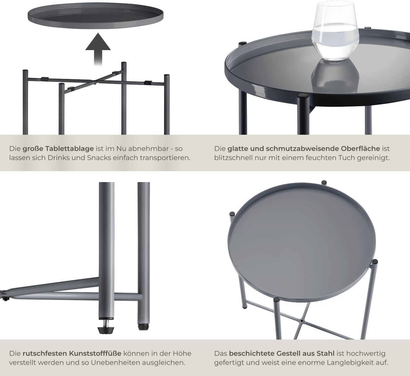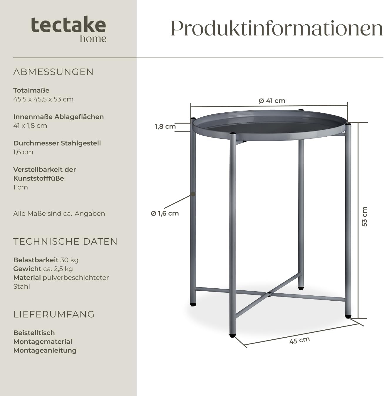 - PRODUKT-DETAILS: Totalmasse (LxBxH): ca. 45,5 x 45,5 x 53 cm // Innenmasse Ablagefläche (ØxH): ca. 41 x 1,8 cm // Durchmesser Tischbeine: ca. 1,6 cm // Verstellbarkeit der Kunststofffüsse: ca. 1 cm // Belastbarkeit: 30 kg // Gewicht: ca. 2,3 kg.