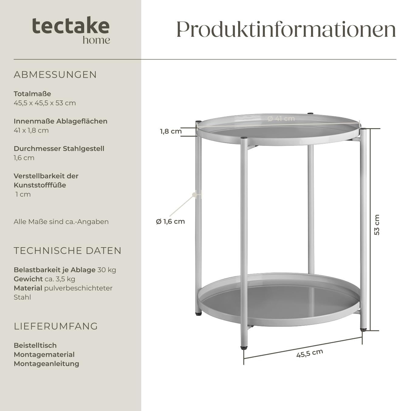 - PRODUKT-DETAILS: Totalmasse (LxBxH): ca. 45,5 x 45,5 x 53 cm // In-nenmasse Ablageflächen (ØxH): ca. 41 x 1,8 cm // Durchmesser Stahlge-stell: ca. 1,6 cm // Verstellbarkeit der Kunststofffüsse: ca. 1 cm // Belast-barkeit pro Ablagefläche: 30 kg //