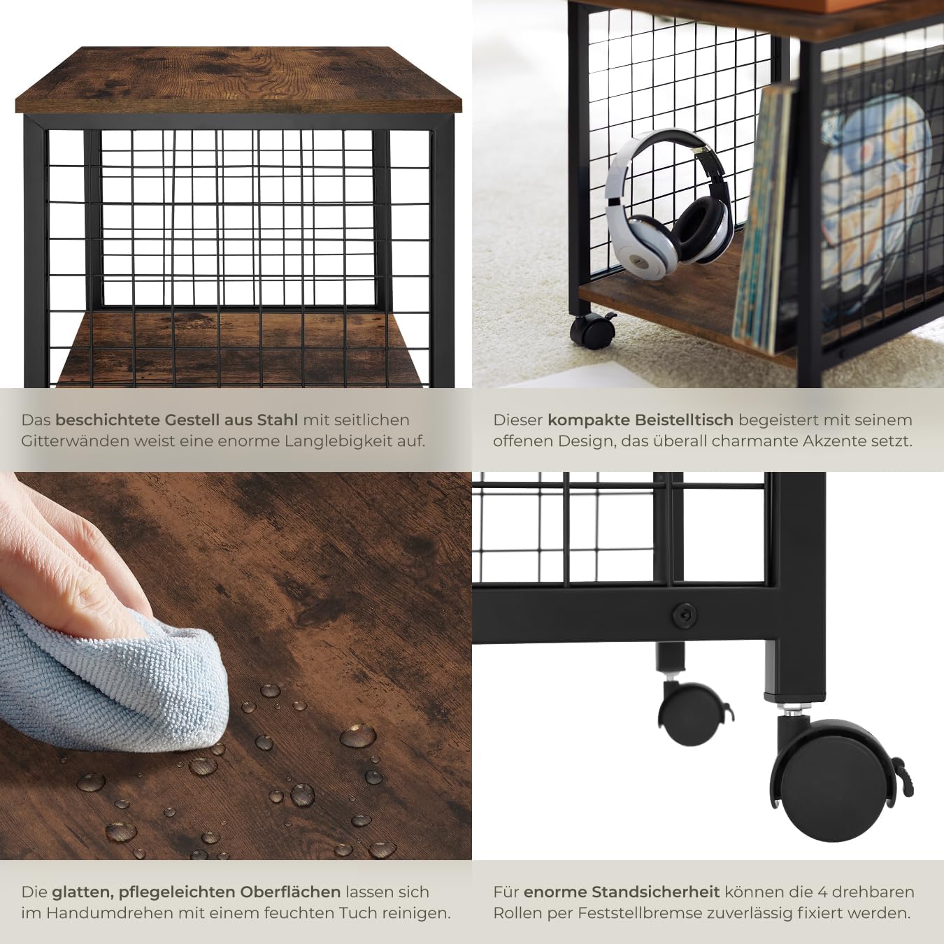 - IMMER GRIFFBEREIT: Dank der vier leichtgängigen Rollen mit Feststellbremse sind die beiden Ablagen des pflegeleichten Beistelltischs immer in Reichweite – perfekt geeignet für leckere Snacks und coole Drinks an einem gemütlichen Abend.