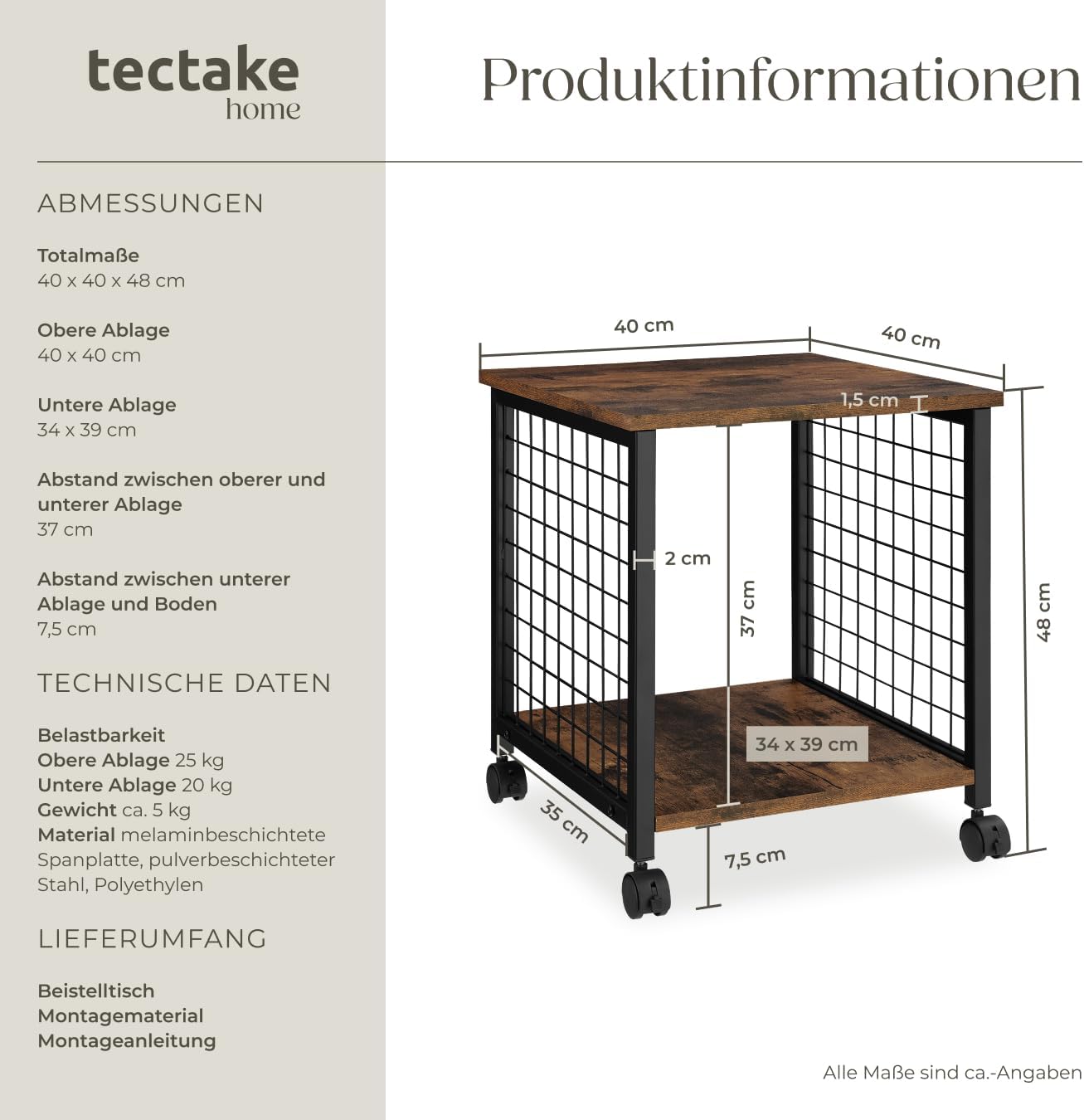 - PRODUKT-DETAILS: Totalmasse (BxTxH): ca. 40 x 40 x 48 cm // Masse obere Ablage (BxT): ca. 40 x 40 cm // Masse untere Ablage (BxT): ca. 34 x 39 cm // Abstand zwischen oberer und unterer Ablage: ca. 37 cm // Dicke der Spanplatten: ca. 1,5 cm // Durchmesser