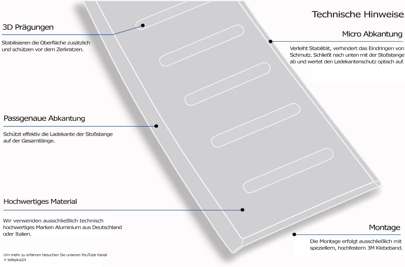 - Lieferumfang: Aluminium Ladekantenschutz mit Abkantung, 3M Montage-Reinigungstuch, Montageanleitung