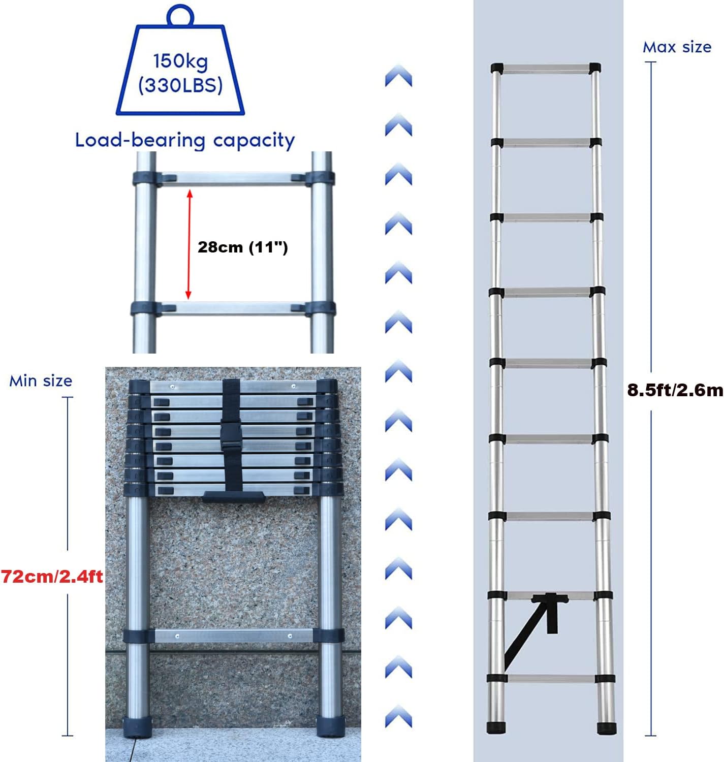 • Leicht zu lagern und tragbar: Leicht und kompakt, Nettogewicht ca. 8 kg, leicht zu transportieren und zu lagern; ein Verschlussgurt sichert die Leiter fest und ist leicht zu tragen;