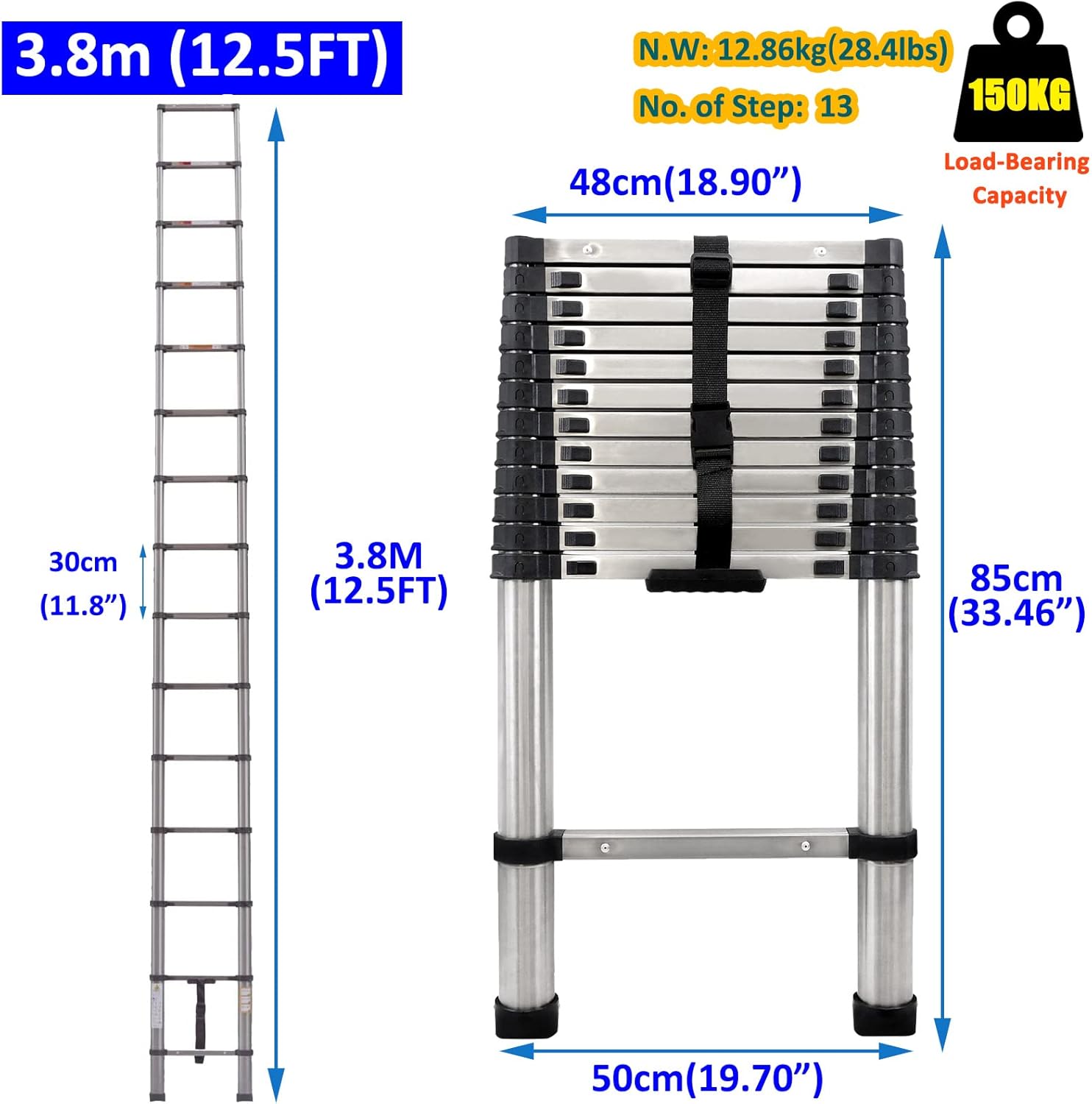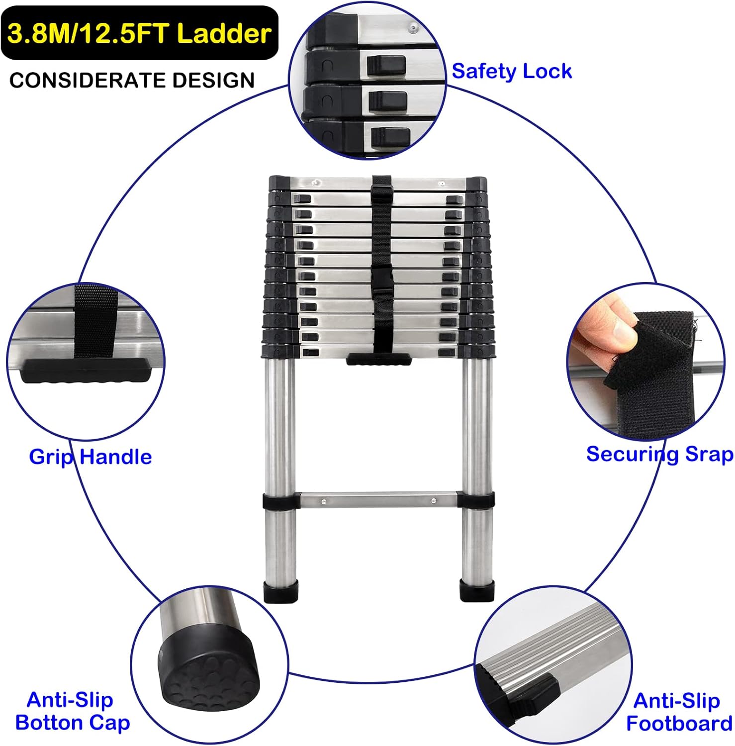 - 【Teleskopleiter aus Edelstahl】Sicherheit ist unsere erste Voraussetzung. Unsere 3,8 m lange Teleskopleiter ist aus hochwertigem Edelstahl gefertigt, sie hat auch ausreichende Kunststoffteile, die mit Nylon verstrebt sind, für erhöhte Langlebigkeit