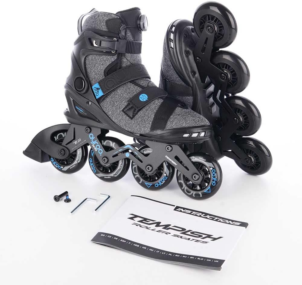 PRODUKTBESCHREIBUNGEN Kolieskové korčule Tempish Ayroo majú veľmi pevný fixný podvozok pre 4 kolieska s maximálnym priemerom 84mm. Spolu s našimi veľmi kvalitnými kolieskami RADICAL sú tieto korčule optimálny kompromis medzi rýchlou jazdu a dostatkom stability aj komfortu. Pohodlný liner je dvojvrstvový. Tvrdšia vonkajšia vrstva drží pevne chodidlo v skelete, zatiaľ čo mäkšia vnútorná vrstva obomkne chodidlo, čím sa docieli pocit vysokého komfortu a bezpečného ovládania korčúľ. V mieste ohybu korčule v členku je v lineri výrez, aby sa pri korčuľovaní dosiahlo anatomickejšieho pohybu nohy nad členkom bez odstránenia podpory nohy pre korčuliarov. Pre väčšiu bezpečnosť korčuliarov sú na korčuliach reflexné prvky zvyšujúce ich viditeľnosť za tmy a pri zhoršenej viditeľnosti. Pevný skelet je odvetraný cez podošvu a vzduch je rozvádzaný vkladaciou stielkou pod celým chodidlom. Moderný "TEMPISH Lacing systém" umožní rýchle dotiahnutie a uvoľnenie korčúľ. Dotiahnutím priehlavkového pásikau a hornej pracky na golieri korčule si každý užívateľ môže sám nastaviť optimálnu pozíciu chodidla v skelete, ideálne a komfortné ovládanie korčule. Oska priemer 6/28 mm. Veľkosť: 38-47 Dĺžka vnútornej vložky: veľ .: 38 - 24,4cm veľ .: 39 - 25,0cm veľ .: 40 - 25,6cm veľ .: 41 - 26,3cm veľ .: 42 - 26,7cm veľ .: 43 - 27,4cm veľ .: 44 - 28,3cm veľ .: 45 - 28,8cm veľ .: 46 - 29,5 cm veľ .: 47 - 30,2cm