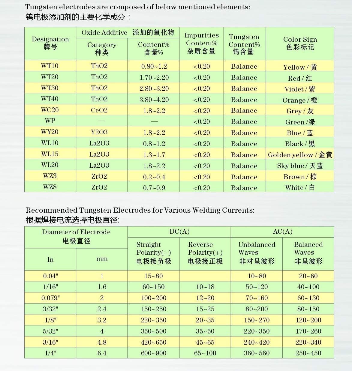 - Eigenschaften der Verbundelektrode: Die Verbundelektrode wird im Wolfram durch zwei oder mehr Seltenerdoxide hinzugefügt. Verschiedene Zusatzstoffe ergänzen sich, ergänzen sich und bieten eine hervorragende Schweissleistung.