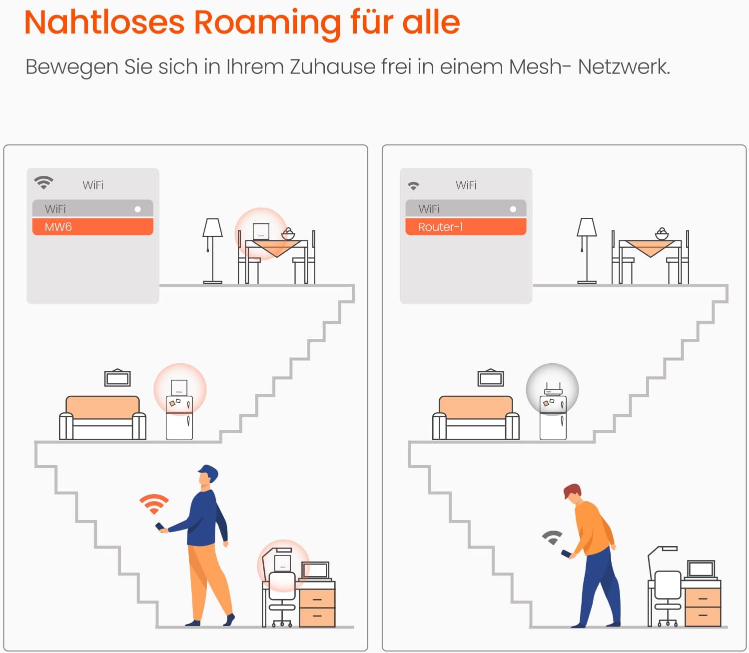 • Eine SSID für das ganze Haus oder Ihrer Wohnung. Das Nova MW6 wechselt immer automatisch zur dichtesten Station für einen nahtlosen WLAN Empfang auch während Sie sich bewegen
