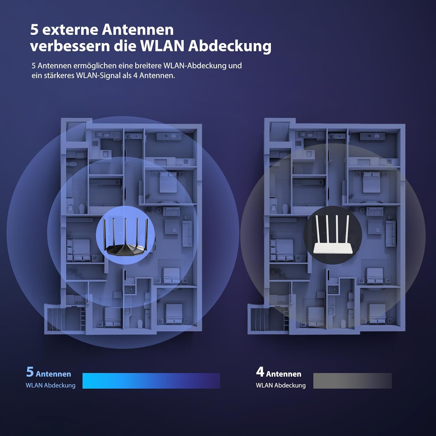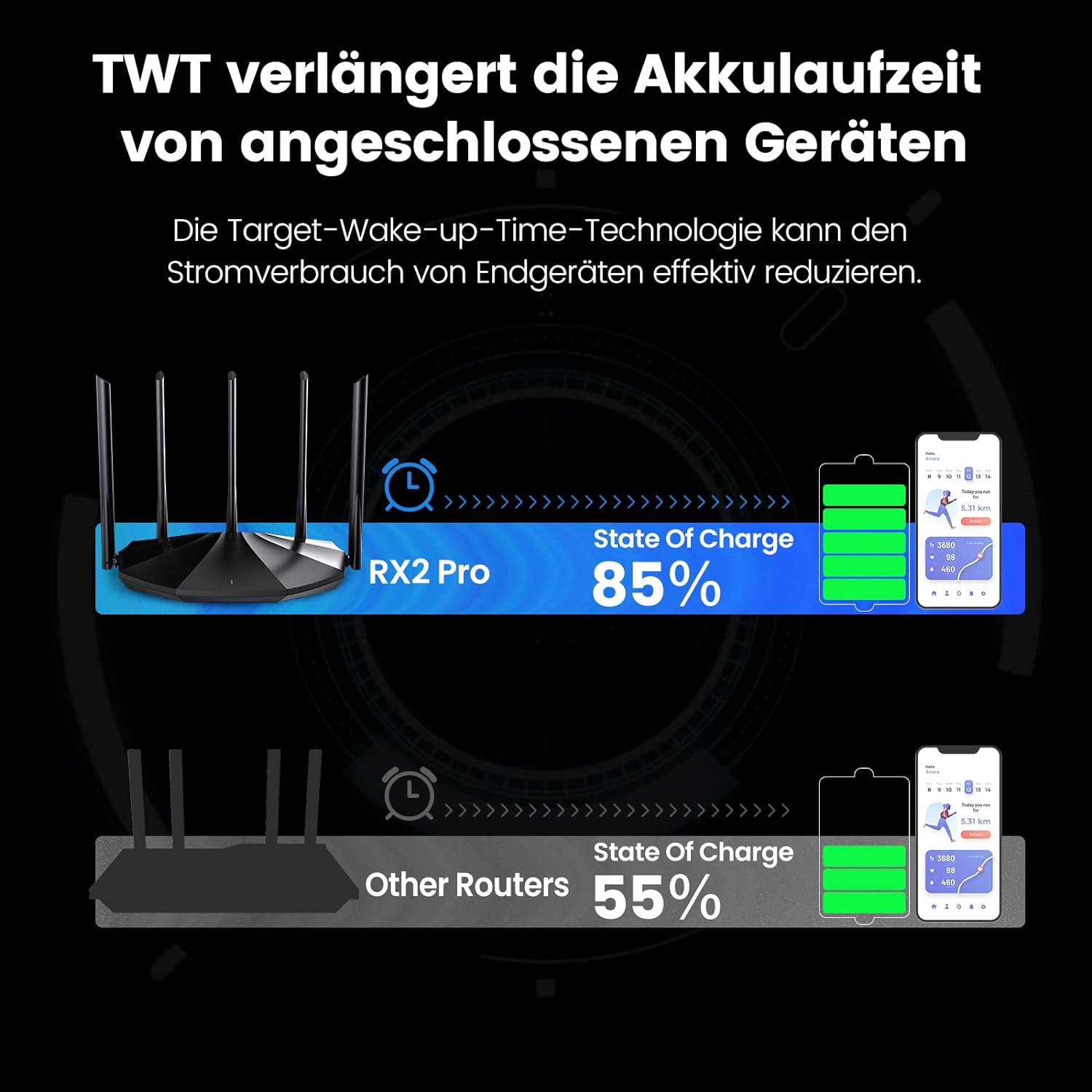 - 【Superstarkes Signal, keine WiFi-Totzone】Der RX2 Pro WLAN Router ist mit 5*6dBi externen Antennen und einem leistungsstarken Signalverbesserungsmodul ausgestattet, um die Signalübertragung und die Empfangsempfindlichkeit zu verbessern, und strebt