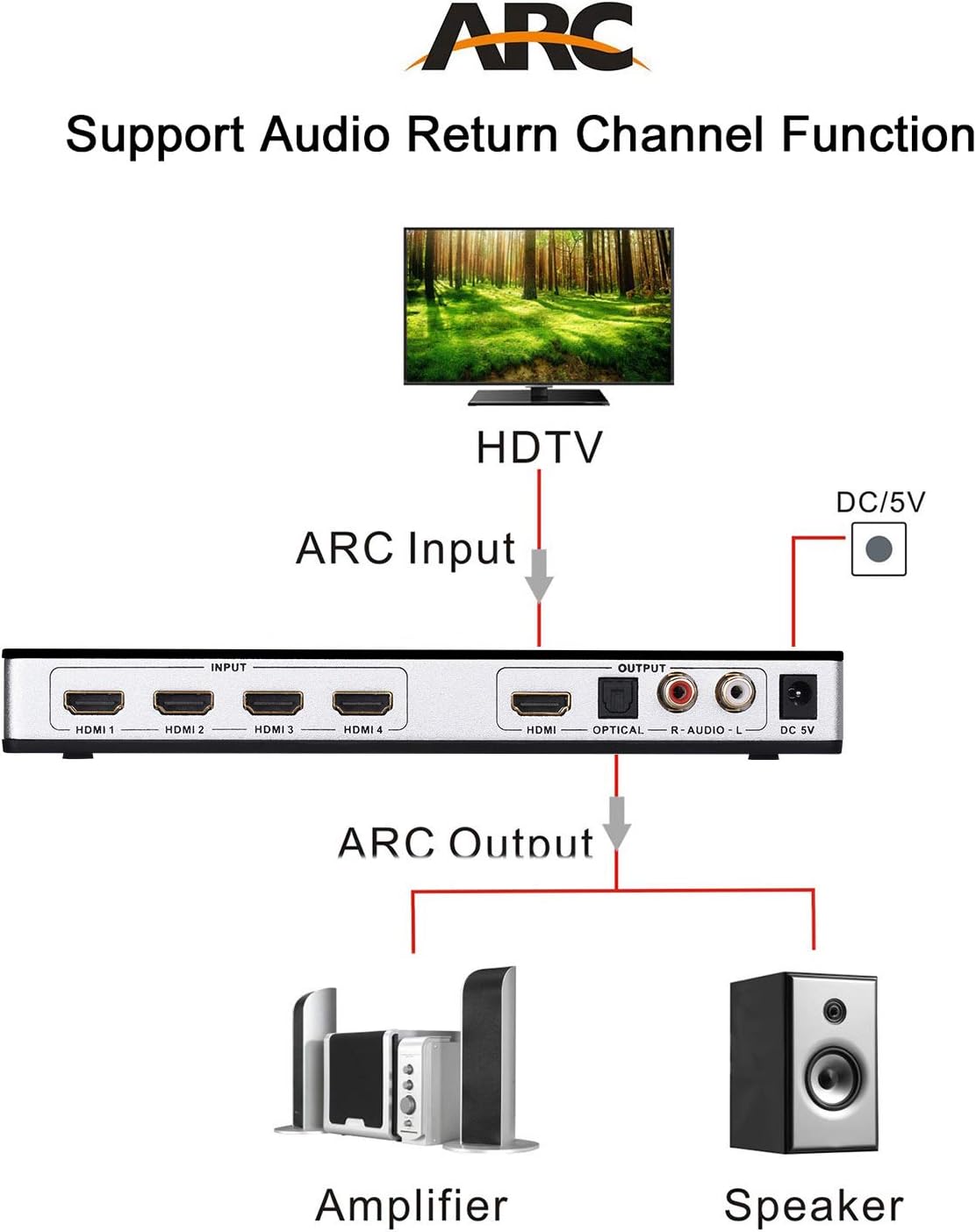 - HDMI Audio Extract und ARC-Funktion: Keine Tonverzerrung. Extrahieren von Audio aus der HDMI-Quelle und Ausgabe an Ihren Lautsprecher über die optische und die L / R-Schnittstelle (5.1-Kanal-Digital-Surround-Audio am optischen Ausgang / 2,0-Kanal-Analog-Stereo am R / L-Ausgang) Unterstützt die ARC-Funktion (Audio Return Channel). Sie können Audio von Ihrem Fernseher in Ihr Soundbar-System extrahieren. Unterstützt die Formate DTS Digital, DTS-HD, Dolby True-HD, Dobly Digital und LPCM.