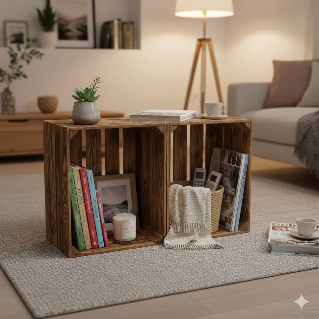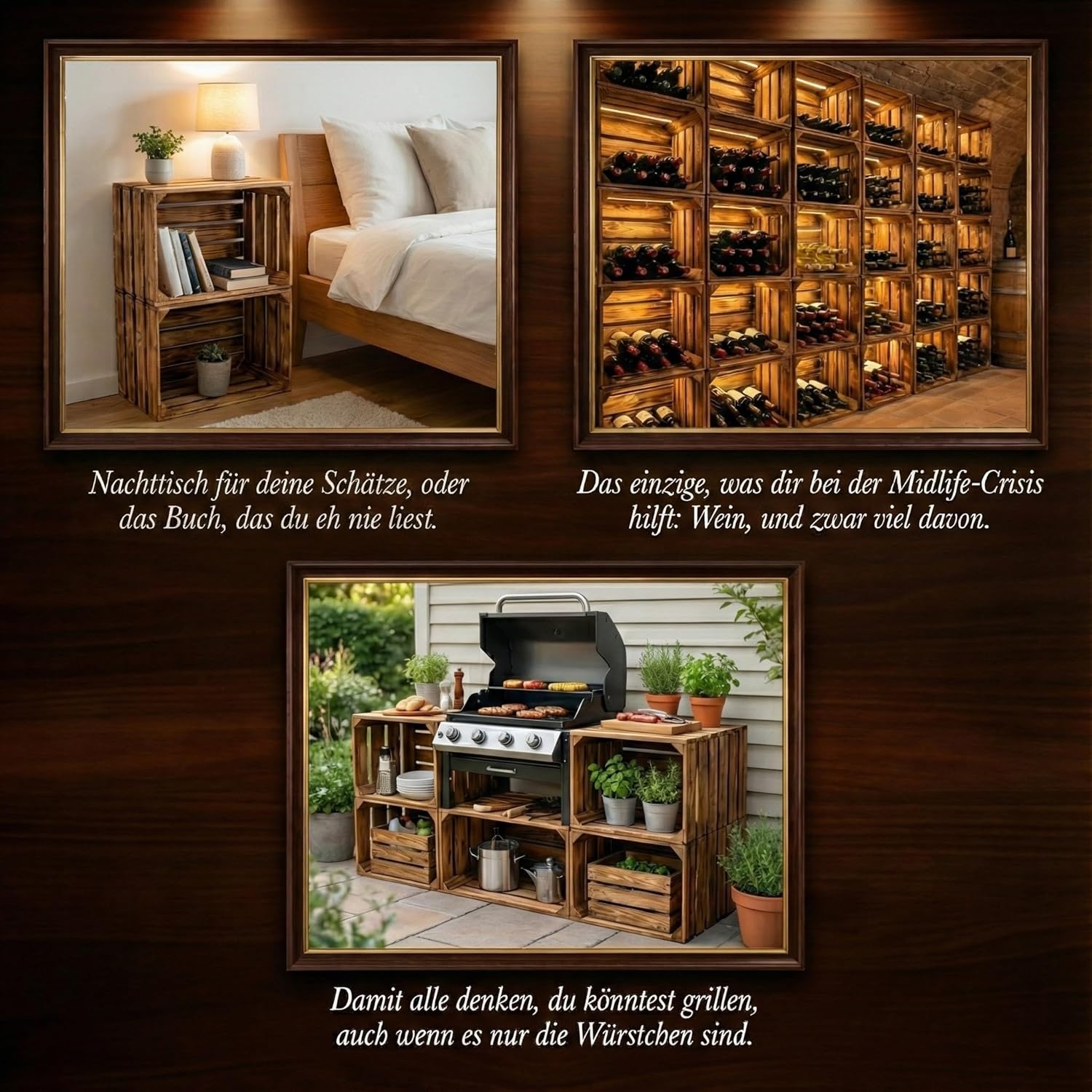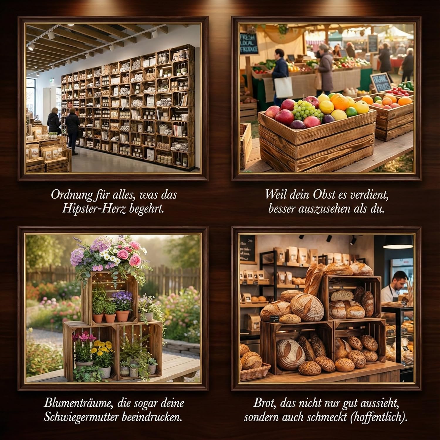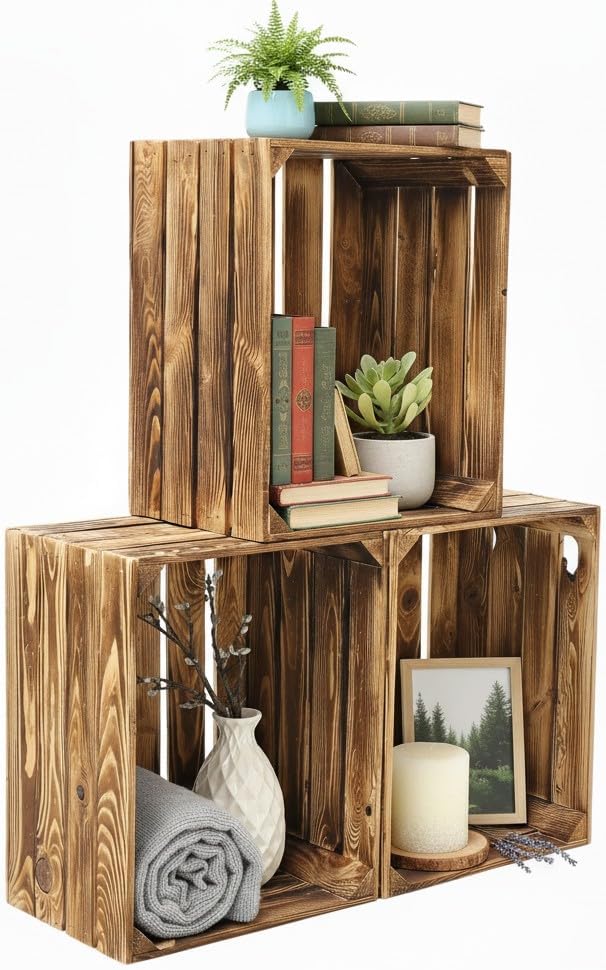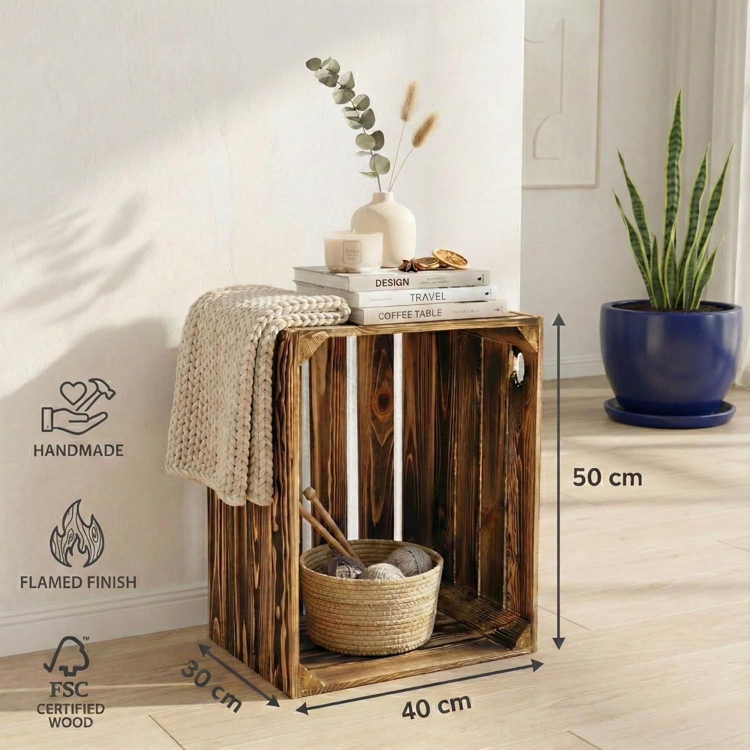 - Bring Natur ins Haus: Unsere geflammten Holzkisten verwandeln jeden Raum in eine gemütliche Oase. Ob als Bücherregal, Deko-Element oder praktischer Aufbewahrungskorb – sie sind ein echter Hingucker!