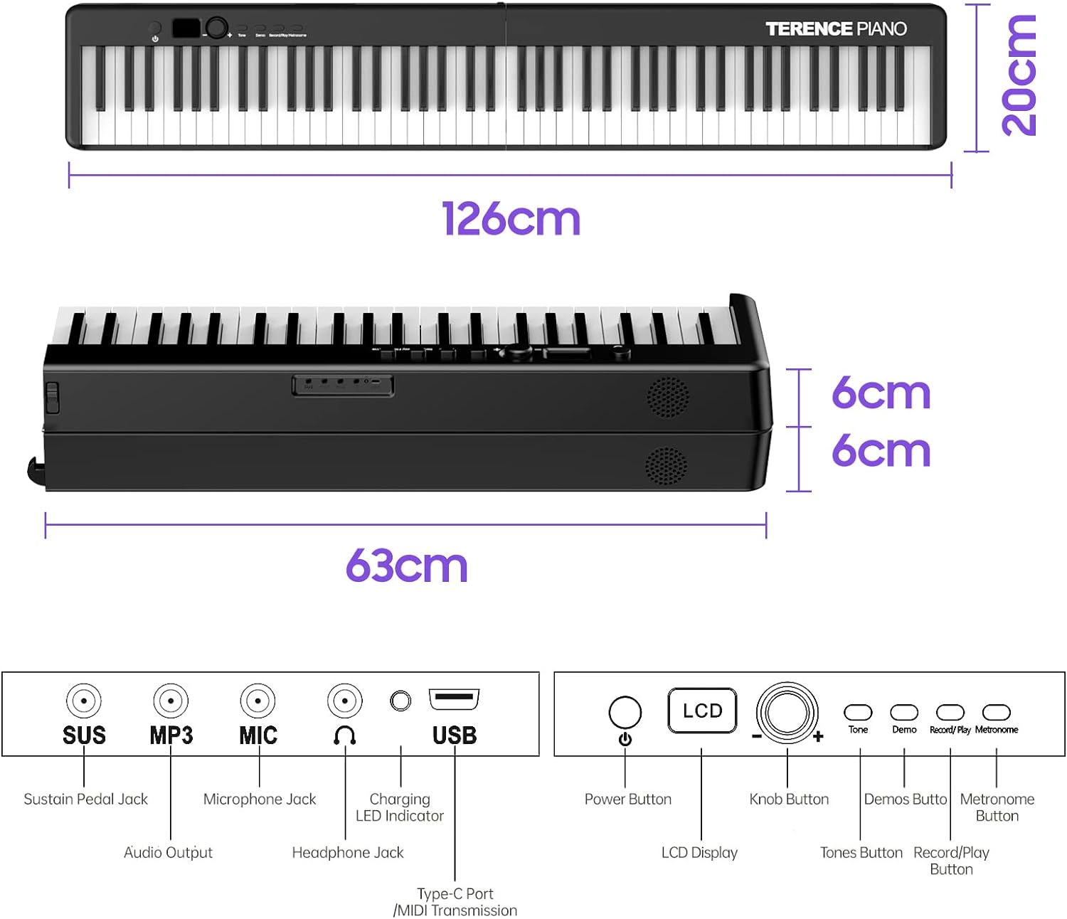 - Spielen ohne Netzkabel: Das Piano ist mit einem eingebauten wiederaufladbaren 1800-mAh-Akku ausgestattet, der bis zu 8 Stunden ununterbrochene Spielzeit liefert, nachdem er 5 Stunden lang über den mitgelieferten Adapter (5V 2A) vollständig aufgeladen