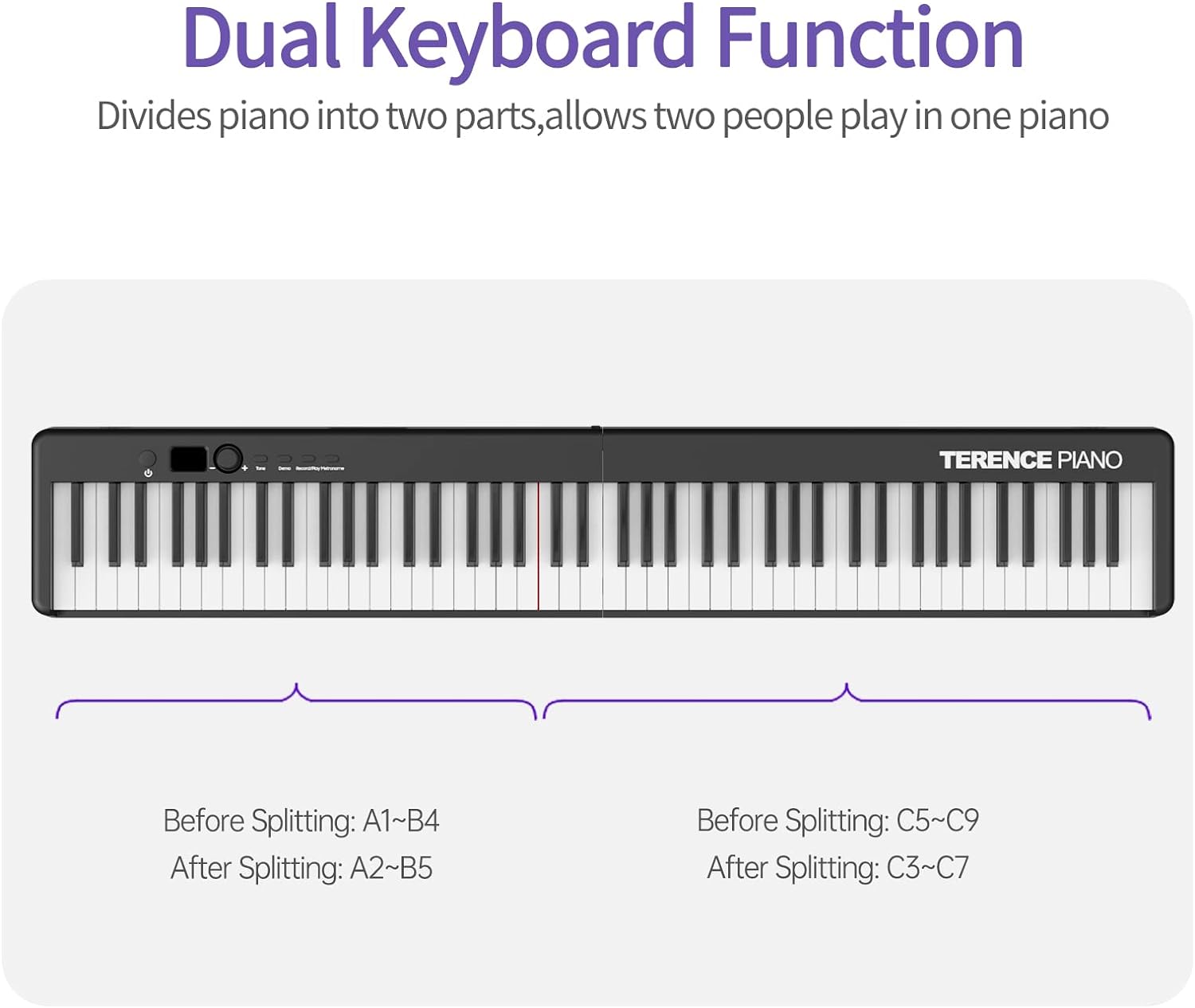 - Faltbare Tastatur: Das tragbare Piano kann zur einfachen Aufbewahrung einfach zusammengeklappt und auf jeder ebenen Fläche neu positioniert werden. Die Verbindungsschnalle ist verbreitert und der Designport zeigt nach oben, um die Stabilität nach dem