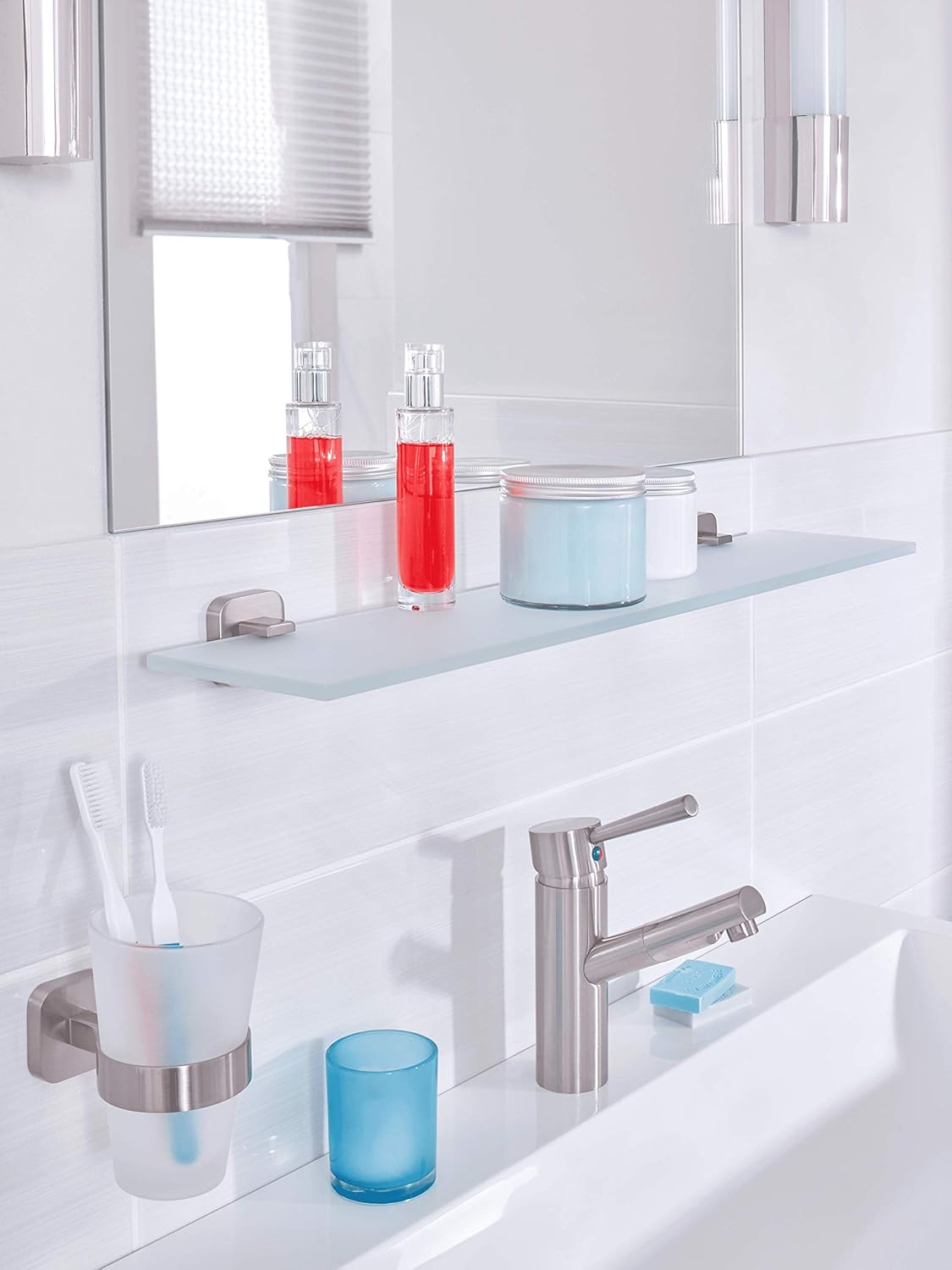 - Design, das Ordnung schafft: Zwei eckige, verchromte Wandhalter tragen die Milchglas-Platte - die Badezimmerablage bietet nicht nur wertvollen Stauraum, sondern ergänzt elegant moderne Design-Konzepte