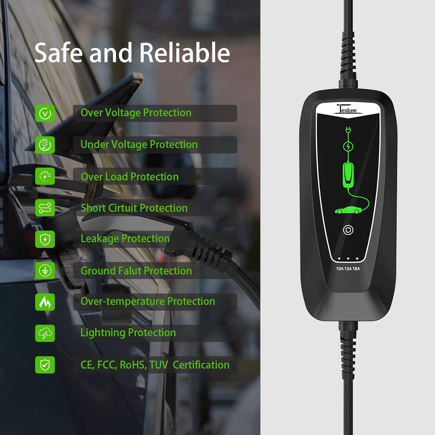 - ▶ Einzigartiges Technologiedesign | Anzeigelampe am Stecker zeigt Ihnen den Ladestatus Ihres Autos an. Die Anzeigelampen leuchten während des Ladevorgangs und erlöschen, wenn sie vollständig geladen sind. Fortschrittlicher Chip behebt automatisch