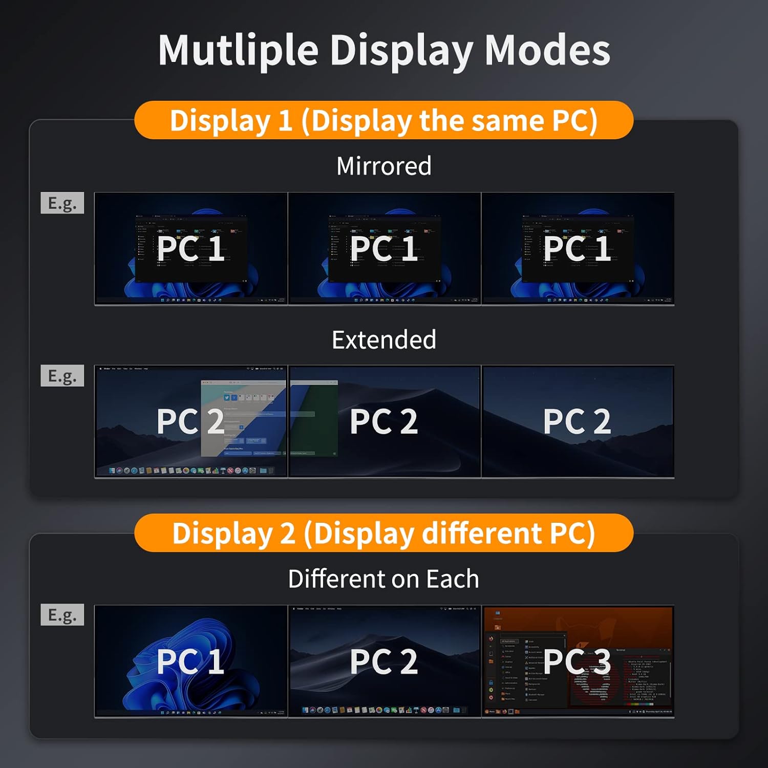 • 【HDMI KVM Switch 4 IN 3 OUT mit 2 Anzeigemodi】 Kontrollieren Sie mühelos bis zu 4 PCs mit nur einer Tastatur und Maus. Der erste Anzeigemodus ermöglicht die gleichzeitige Darstellung eines einzigen Eingangsquellbildes auf allen 3 Monitoren –