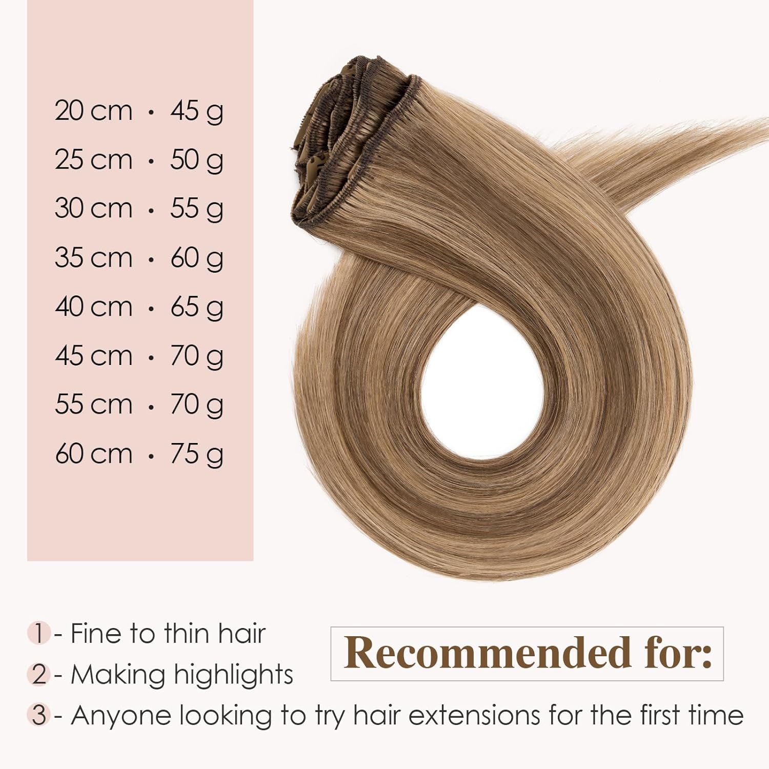 - Ombre Clip in Extensions Echthaar, Länge: 20 Zoll, Gewicht: 70g. Die Haarstärke hängt vom Haargewicht ab, schwerer ist dicker. 1 Packung ist dünn, wenn Sie mittleres oder dickes Haar haben, empfehlen wir 2-3 Packungen oder versuchen Sie einen