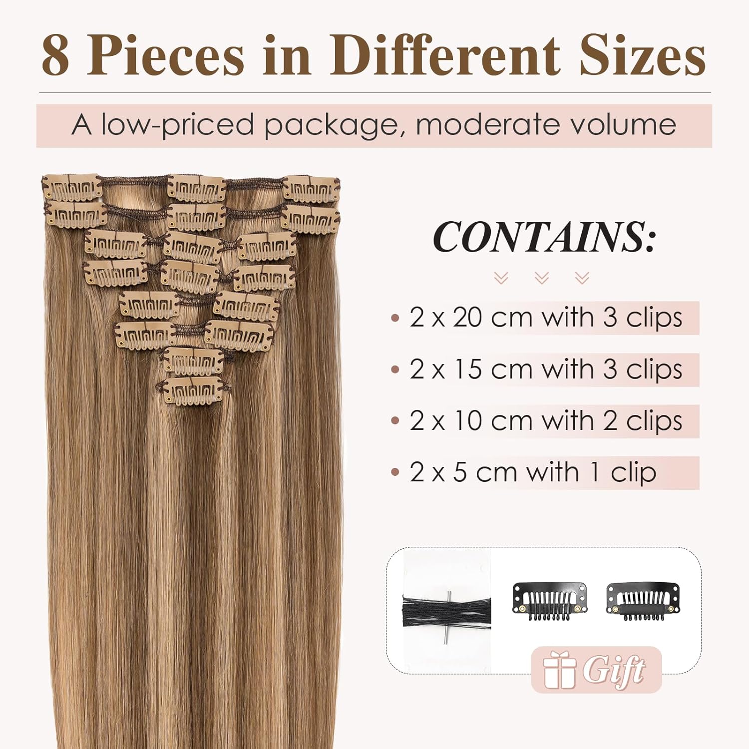 - 8 Tressen Haarverlängerung mit Clips an, fügen Länge und Volumen in 5 Minuten hinzu, ohne Ihr Haar durch Leim oder Klebebänder zu beschädigen.