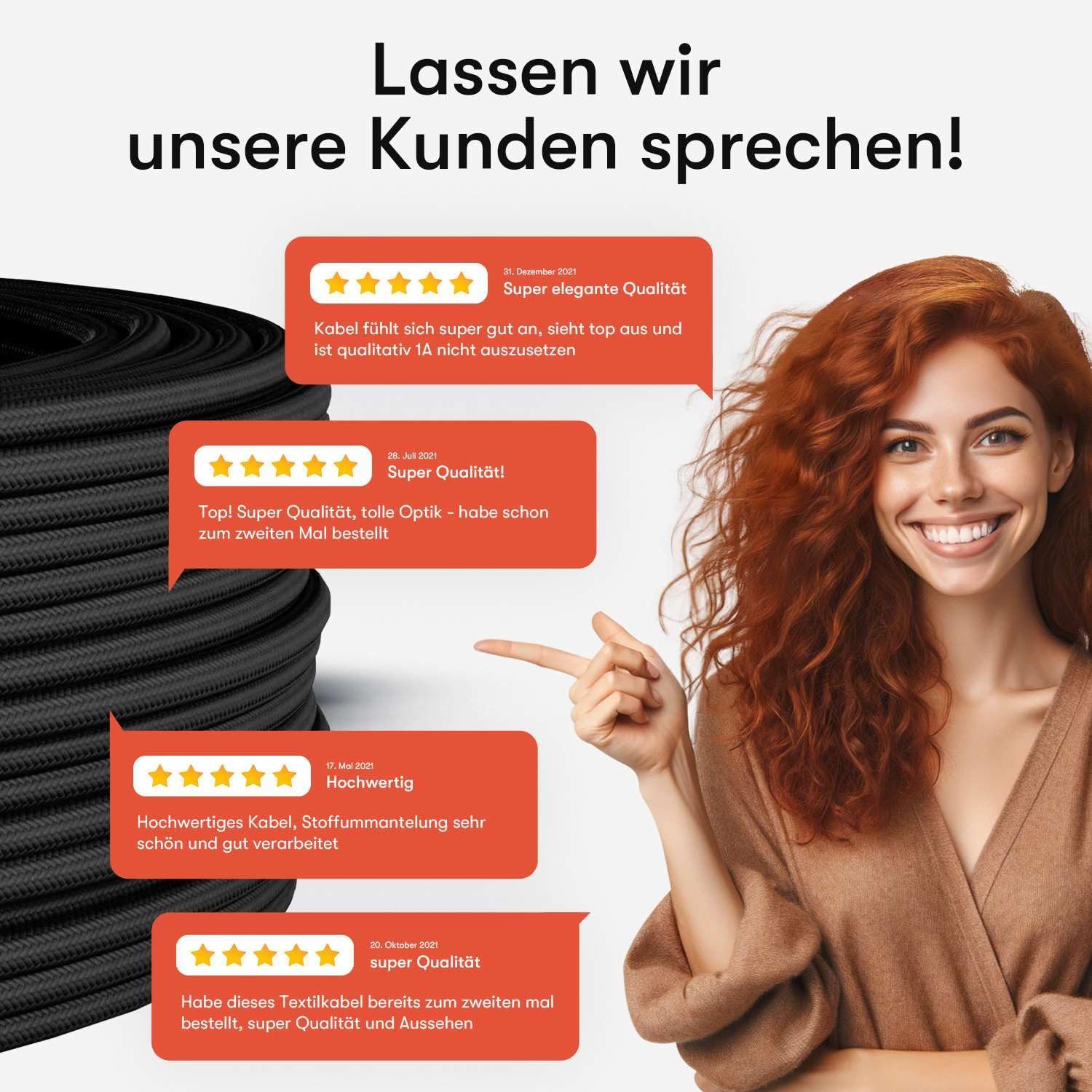 • Sie kaufen Premiumqualität & Normkonformität: Wir verkaufen ausschliesslich hochwertiges und sicheres Textilkabel nach DIN EN 60598 hergestellt in der Europäischen Union in Konformität zur Niederspannungsrichtlinie 2006/95/EG