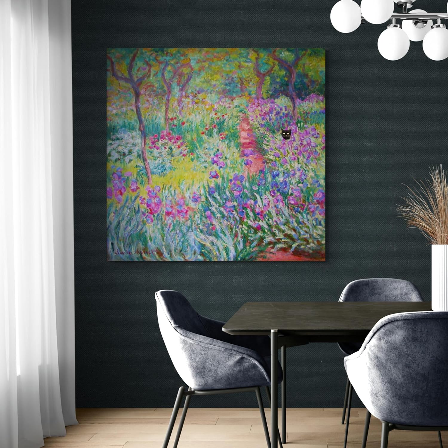 - The Artist's Garden in Giverny von Claude Monet mit schwarzer Katze – lustige Wandkunst – gerahmte Leinwand
