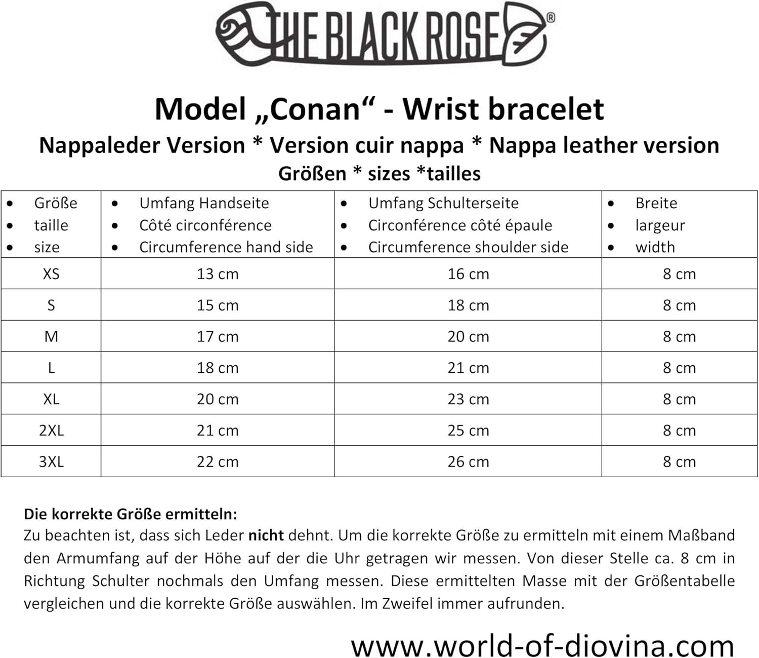 PRODUKTBESCHREIBUNGEN Geldbörse für das Armgelenk in einer spezial KITTY-Club-Edition Ein geiles Lederarmband aus doppeltem Nappaleder bzw. Latex! Das Leder-/Latexarmband kann als Geldbörse oder nur als "Schmuck" benutzt werden. Geeignet für Geldschein, Fahrkarten, Kleingeld und vieles mehr. Ideal für den Party- und Clubbesuch. Passende Grösse auch für Deinen Handgelenksumfang: * Model: Conan * Material: Nappaleder oder Latex * Materialzusammensetzung: 100% Nappaleder oder 100% Naturlatex * Breite: 8 cm * Verschluss: Druckknöpfe Der innenliegende verdeckter Reisverschluss verschliesst die Geldbörse ohne den Gesamteindruck zu stören Die korrekte Grösse ermitteln: Zu beachten ist, dass sich Leder nicht dehnt, Latex hingegen schon. Um die korrekte Grösse zu ermitteln mit einem Massband den Armumfang auf der Höhe auf der die Uhr getragen wir messen. Von dieser Stelle ca. 8 cm in Richtung Schulter nochmals den Umfang messen. Diese ermittelten Masse mit der Grössentabelle vergleichen und die korrekte Grösse auswählen. Im Zweifel immer aufrunden.