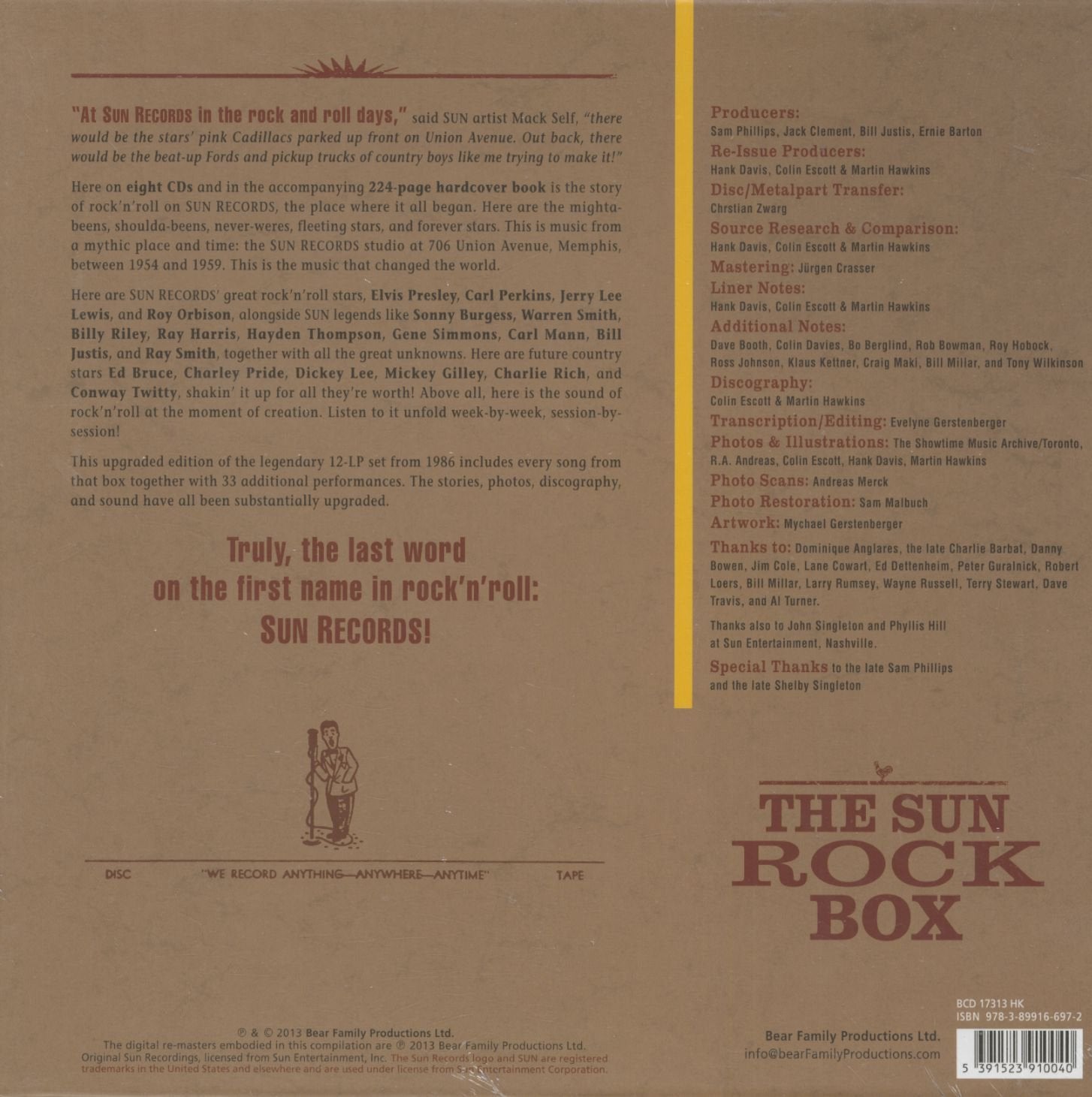 PRODUKTBESCHREIBUNGEN 8-CD Box (LP-Format) mit 224-seitigem gebundenem Buch, 254 Einzeltitel, Spieldauer ca. 10 Stunden 20 Minuten. DIE SUN ROCK BOX. Die absolut notwendige Box. Und noch ein Mal, neu gemasterte Aufnahmen, neue Fotos, neue Informationen und neue Interviews: ein besonderer Begleiter unserer bereits veröffentlichten Sun-Themenboxen. Ein weiteres Mal gilt unser Augenmerk nicht nur den bekannten Namen wie Jerry Lee Lewis, Charlie Rich oder Roy Orbison. Die eigentliche Geschichte erzählen die wilden Typen wie Billy Riley, Sonny Burgess, Mack Vickery, Jesse Lee Turner und viele andere. Selbst Charley Pride, der erste und einzige schwarze Country-Superstar, machte seine ersten Aufnahmen als Rock 'n' Roll-Sänger auf Sun! Zwischen 1950 und 1960 entdeckte und produzierte Sam Phillips, Gründer von Sun Records, B.B. KING, HOWLIN' WOLF, IKE TURNER, ELVIS PRESLEY, JOHNNY CASH, CARL PERKINS, JERRY LEE LEWIS, CHARLIE RICH und ROY ORBISON Künstler, die die Geschichte der Popmusik veränderten. Er erledigte dies mit Hilfe von nur ein oder zwei Angestellten in einem Studio, das sich in einem kleinen Laden in Memphis, Tennessee, befand. Zu den anderen Künstlern, die ihre ersten Aufnahmen bei Sun machten, gehören RUFUS THOMAS, BOBBY BLAND, JUNIOR PARKER, LITTLE MILTON, CONWAY TWITTY, CHARLEY PRIDE und viele andere! -- Nachdem er 1952 mit Jackie Brenstons 'Rocket 88' einen der grössten Hits der Prä-Rock 'n' Roll-Ära produziert hatte, startete Sam Phillips Sun Records mit einer einzigen lokalen Veröffentlichung und liess anschliessend das Label für ein Jahr ruhen. 1953 dann wurde das Sun-Label wiederbelebt und veröffentlichte Singles bis zur Schliessung im Jahr 1968.