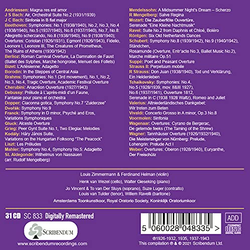 PRODUKTBESCHREIBUNGEN A unique collection of Philips, Columbia and Telefunken recordings, with some works represented twice, to allow the listener to appreciate Mengelberg’s different interpretations of the same composition. Mengelberg's recordings with the Concertgebouw Orchestra are marked by frequent use of an unusually prominent portamento, which can be appreciated in the sliding from one note to the other of the string players. He transformed the Concertgebouw, which he loved and considered his ‘instrument’, from being average, into a world-class orchestra, still regarded as one of the best ensembles. The 23 November 1939 premiere of Zoltán Kodály’s Peacock Variation and the immortal and still unrivalled recording of Mahler’s Fourth, are both included in this set. Mengelberg’s was unwavering in his mission to draw out flawless playing and effervescent living lingua franca from his orchestras.