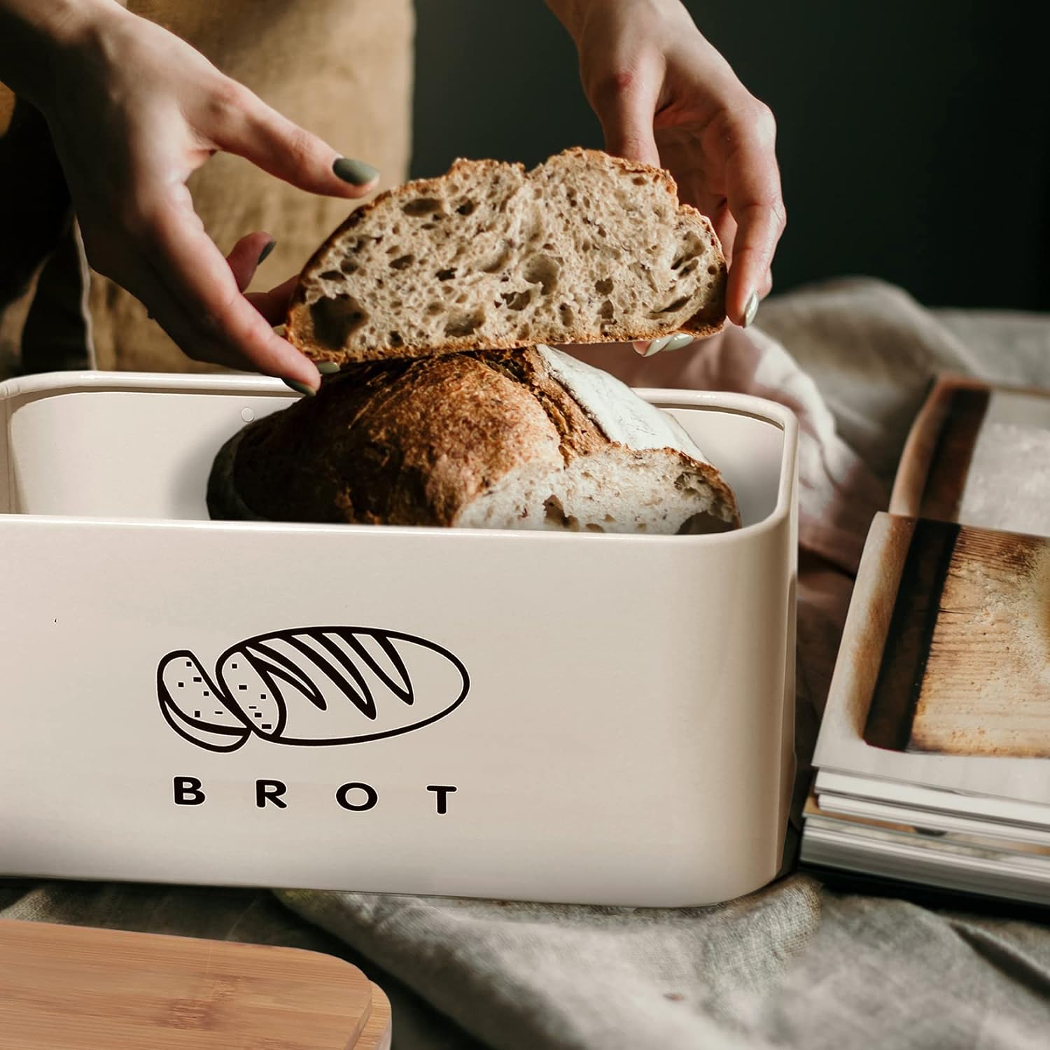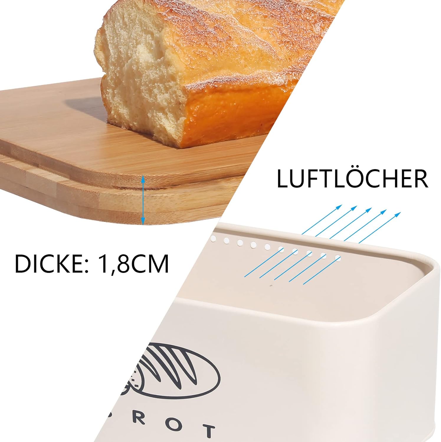 - 3.MULTIFUNKTIONALES SCHNEIDEBRETT : Deckel des Brotkastens besteht aus umweltfreundlichem und nachhaltigem Bambus.Es ist ein praktisches Küchengeschirr, das als Schneidebrett zum bequemen Schneiden von Brot verwendet werden kann.Rillen auf dem