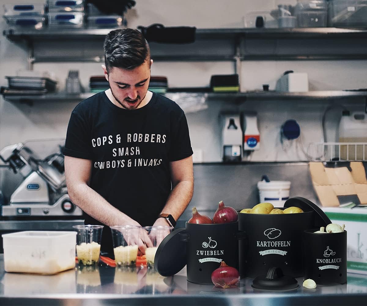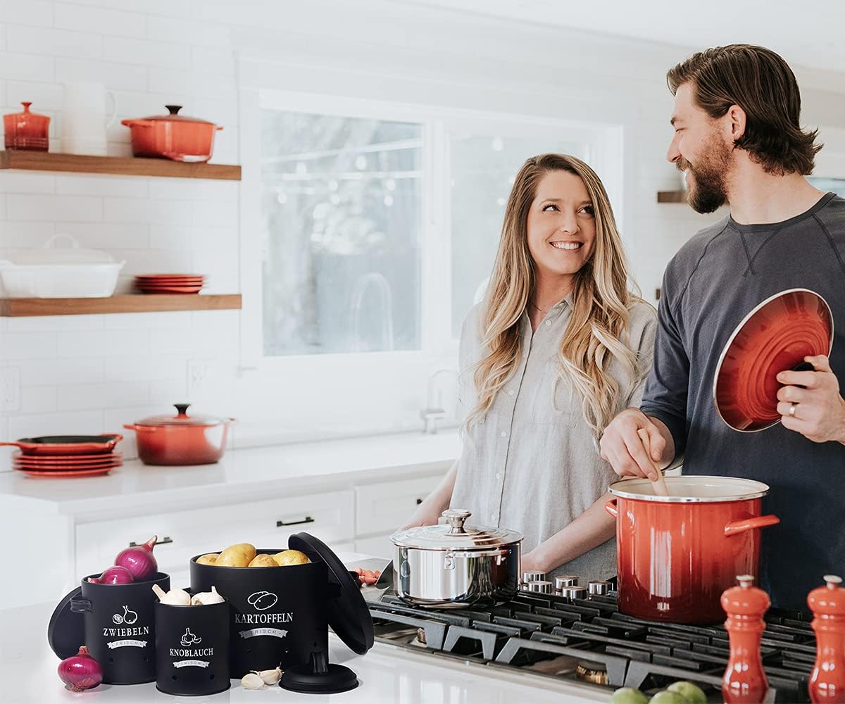 - GENUG PLATZ : Drei Arten von Behältern können alle Arten von Lebensmitteln aufbewahren.Kartoffeltopf (D.23cm * H.23cm) kann bis zu 4 kg Kartoffeln aufnehmen,Zwiebeltopf (D.14cm * H.19cm) kann 1,5 kg Zwiebeln aufnehmen,Knoblauchtopf (D.11cm * H15cm) fasst 12 Knollen.