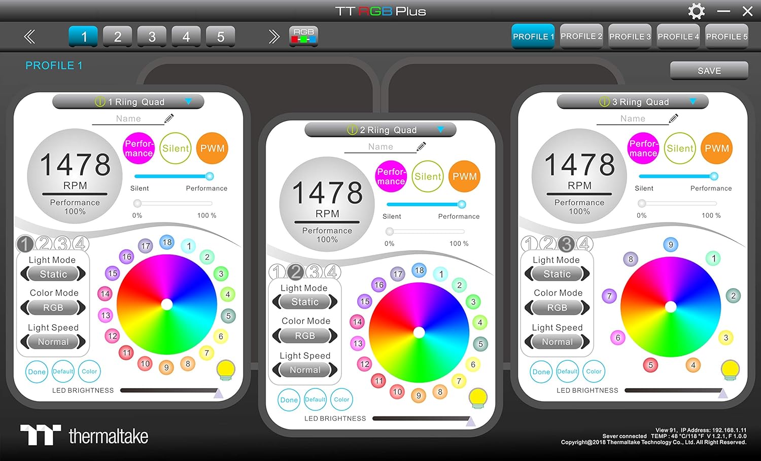 - Der Riing Quad Kühler- / Gehäuselüfter ist einzigartig und in eine Klasse für sich. Er kombiniert herausragende Zuverlässigkeit, geräuschlosen Betrieb und konkurrenzlose Kühlung. Vor allem ist der Lüfter mit 54 LEDs ausgestattet, die auf 4 separate Ringe aufgeteilt sind und lebendige und wunderschöne Lichteffekte erzeugen.