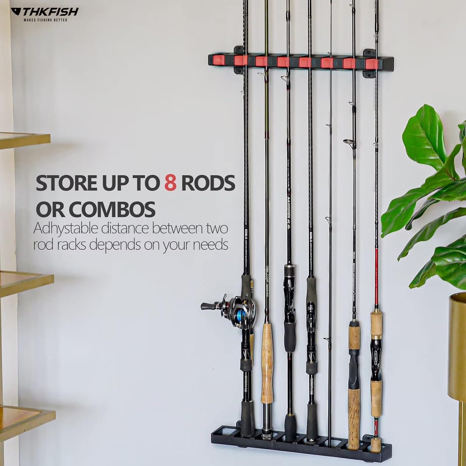 - LAGERUNG VON 8 RUTEN: Der Abstand der Angelrute zur Wandmontage kann an Ihre Rutenlänge angepasst werden. Ermöglicht das Versetzen der Rollen in verschiedenen Höhen, wodurch bis zu 8 Ruten gespeichert und Rollenkollisionen reduziert werden können.