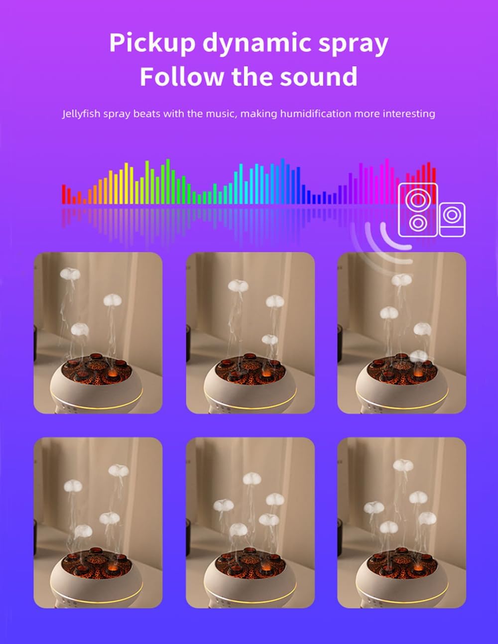 - Klang-aktivierter tanzender Nebel: Einzigartiger quallenförmiger Nebel synchronisiert sich mit dem Rhythmus der Umgebungsmusik und erzeugt eine hypnotisierende visuelle Therapie zur Entspannung